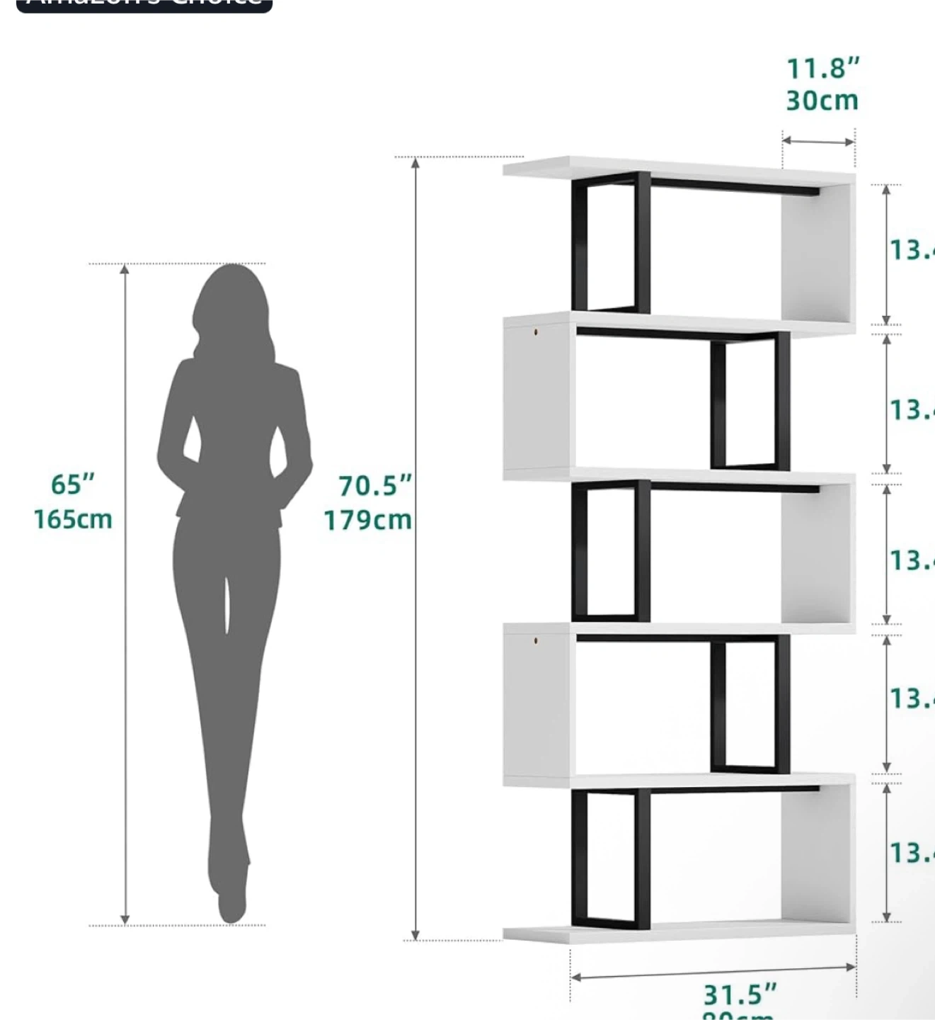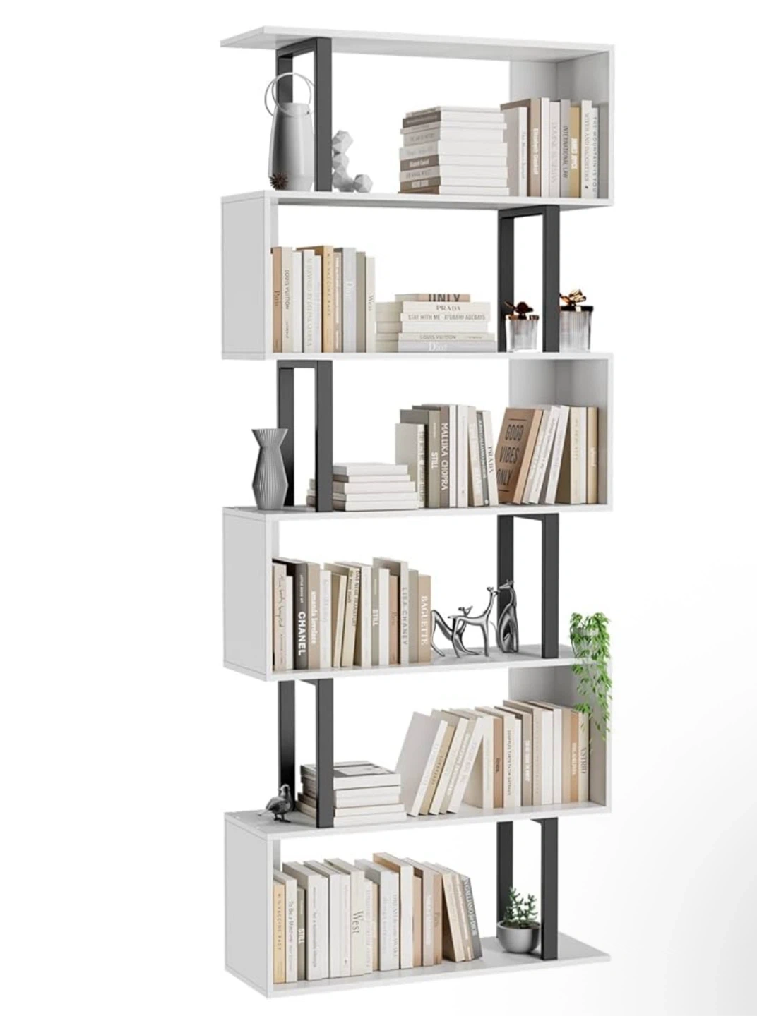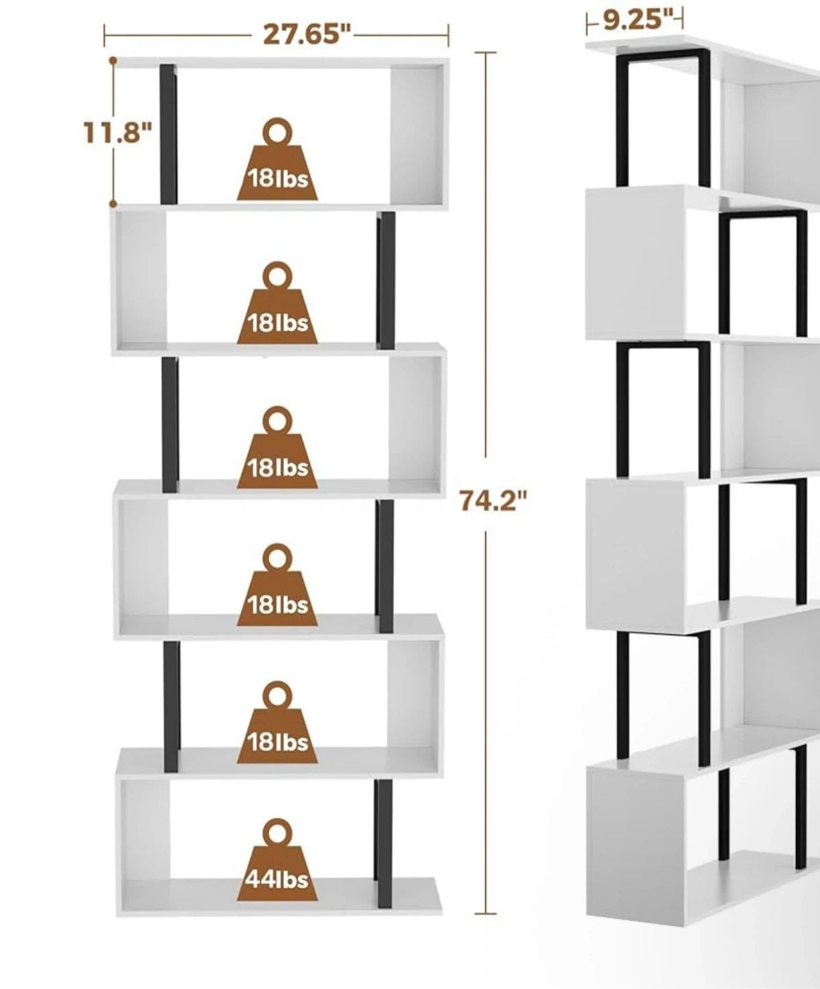 Selling a white 6-tier leaning bookshelf! It's perfect for displaying your favorite books and decor. Key specs: - Dimensions: 27.65" (W) x 9.25" (D) x 74.2" (H) - Shelf Depth: 11.8" - Weight capacity: Each shelf can hold 18 lbs, with the bottom shelf holding up to 44 lbs