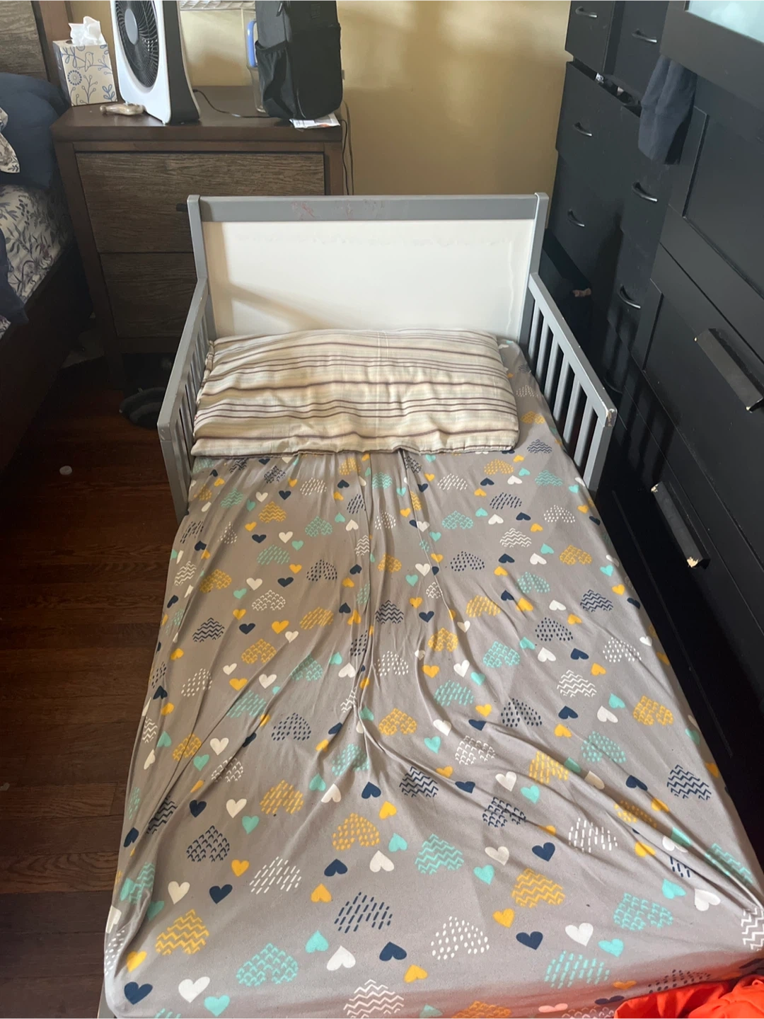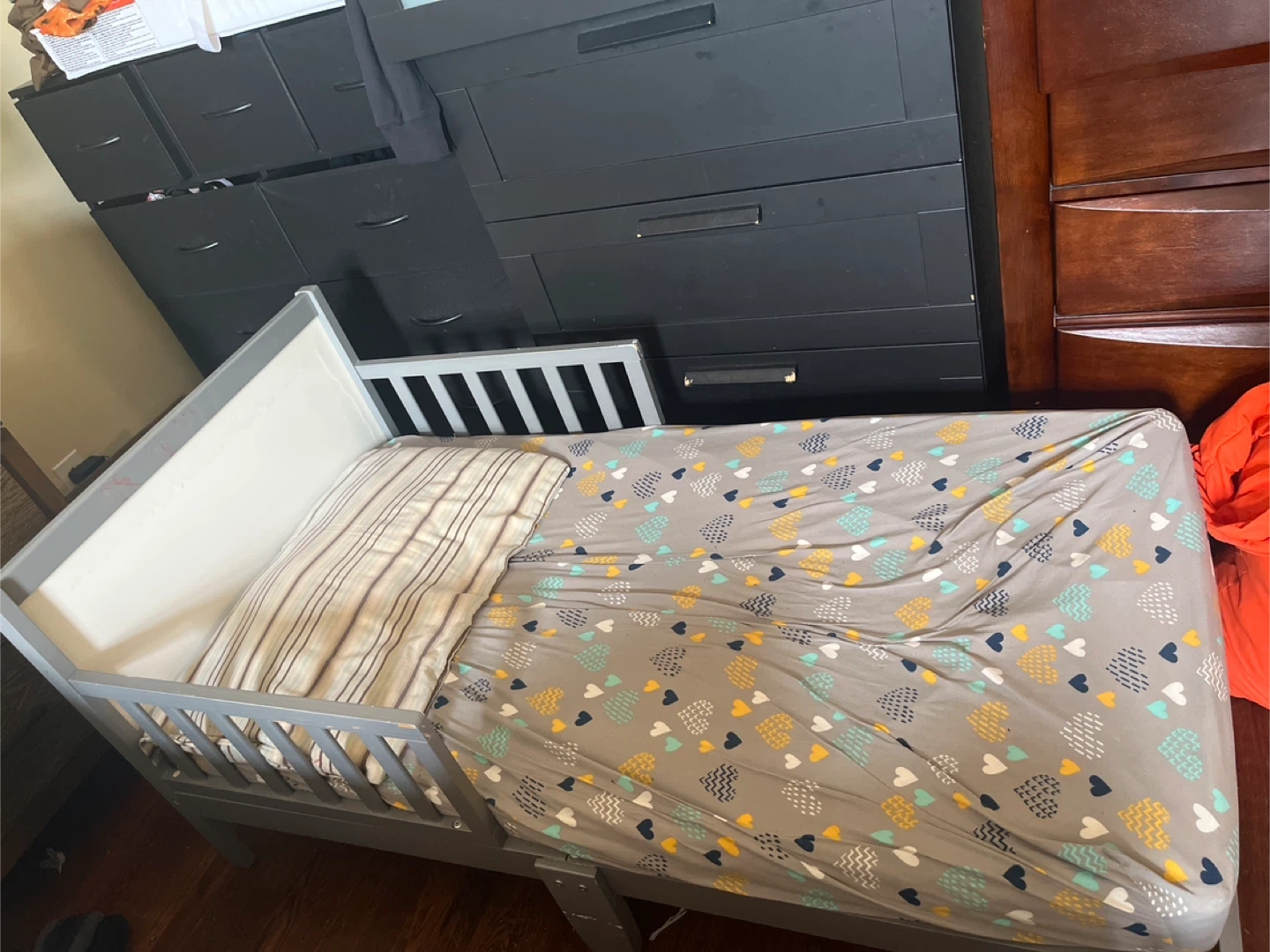Selling a toddler bed that's in great condition! It comes with a mattress and is perfect for transitioning your little one from a crib to a bed. The bed is sturdy and safe, with side rails to prevent falls. The mattress is clean and comfortable