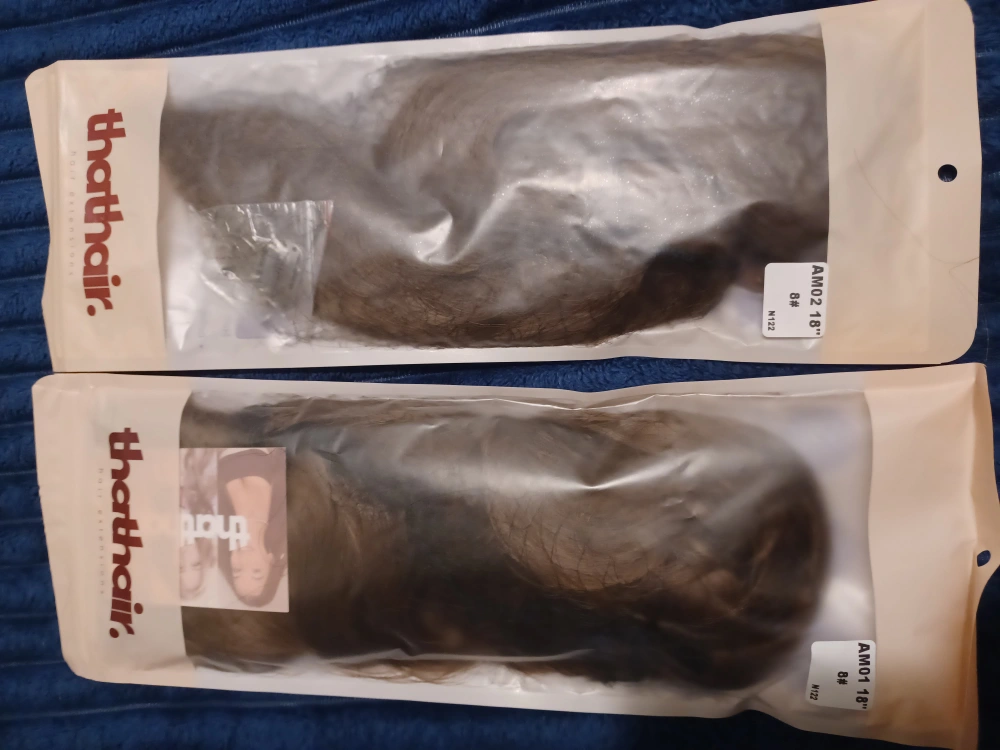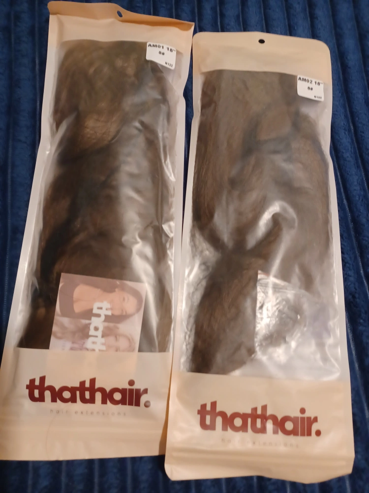 Selling two packs of that hair. hair extensions. One is style AM01 and the other is AM02. Both are 18 inches long and in color 8#. - No tape - No glue - No damage - Instant style - 30-second installation - Blends in seamlessly - Comfortable - Gentle on hair