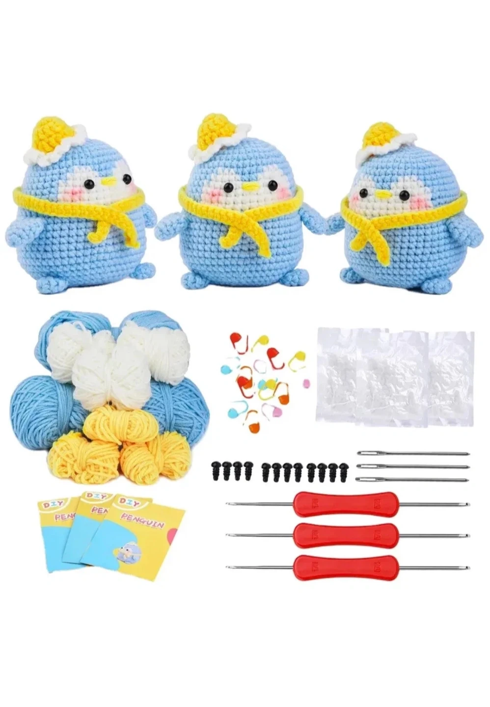 114Get ready to create your own adorable crocheted penguins with this DIY kit! It includes everything you need to get started: yarn in blue, white, and yellow, crochet hooks, stitch markers, needles, and stuffing. Perfect for beginners and experienced crafters alike (K-09)