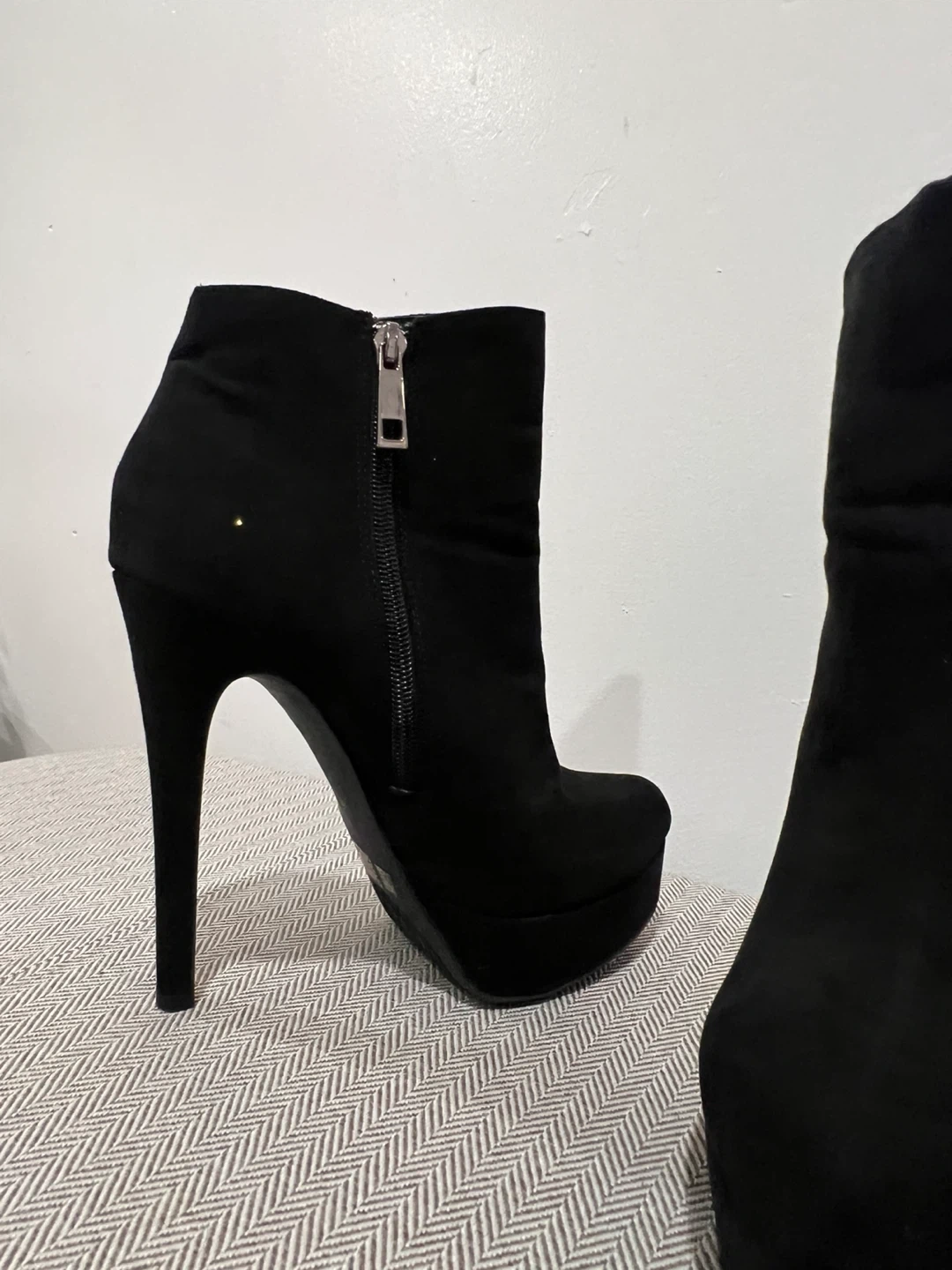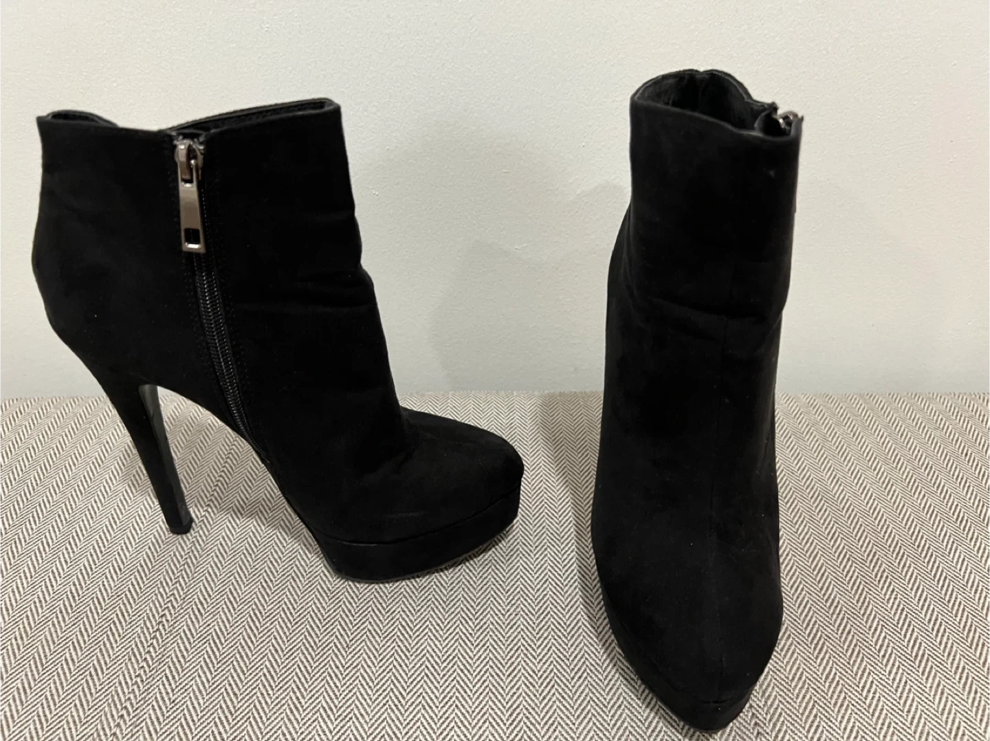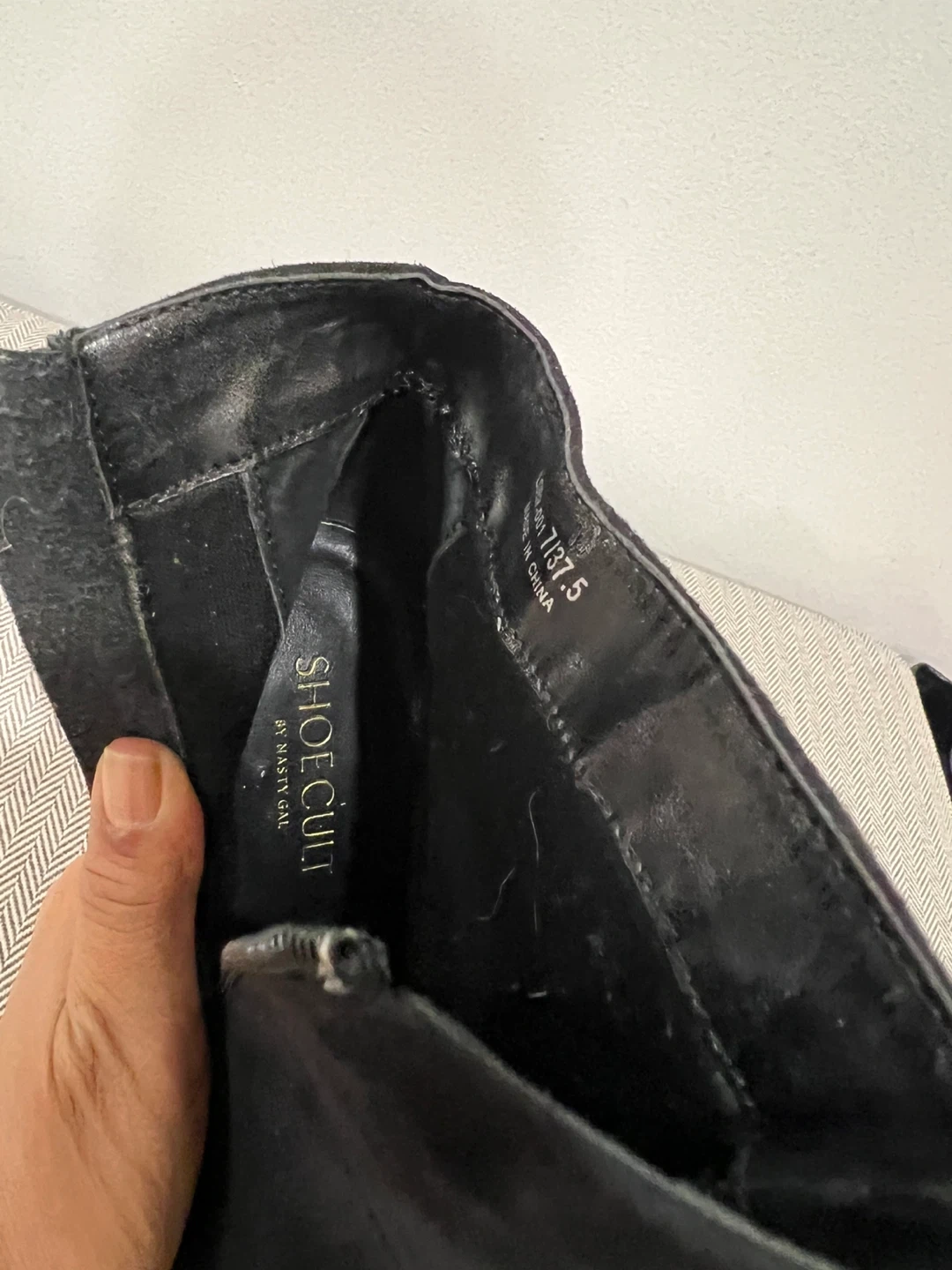 These are a pair of Shoe Cult by Nasty Gal black heels. They are a size 7 (US). They have a zipper on the side.