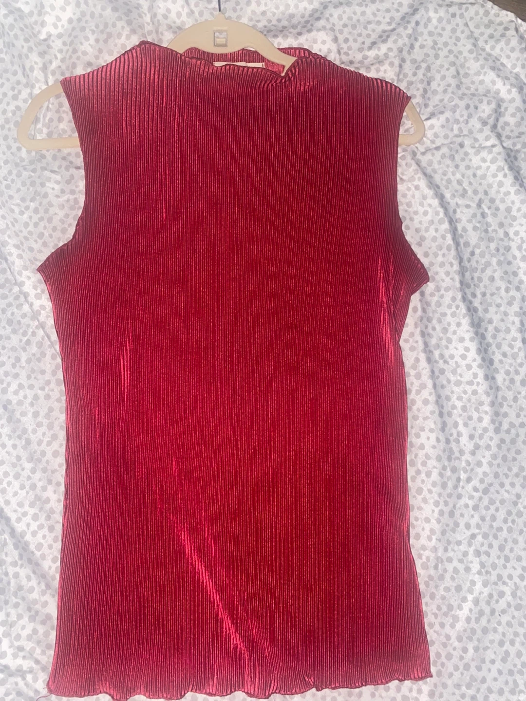 98Cranberry red sleeveless top with a pleated design, high neck, and lettuce hem. It's in great condition and ready for a new home