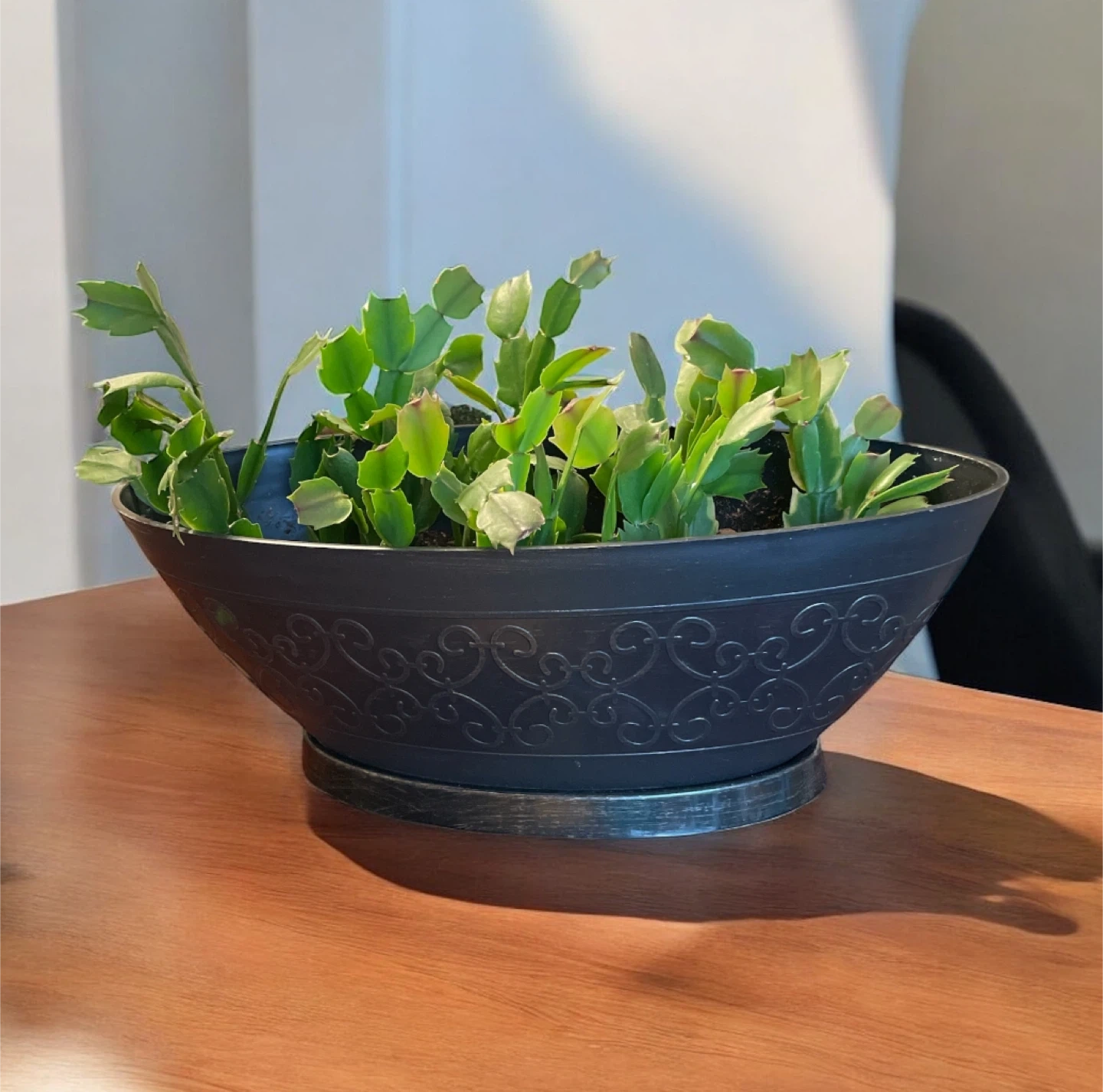 I'm selling a beautiful Christmas Cactus in a decorative dark brown pot. Pot measurements - top 8” x 17” - bottom 11” x 5.5” Blooming: The Christmas cactus plant is known for blooming in the late fall and winter.