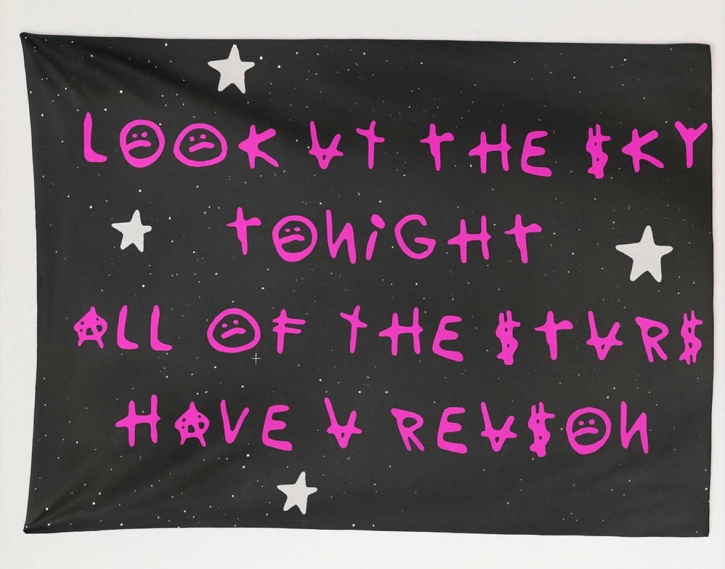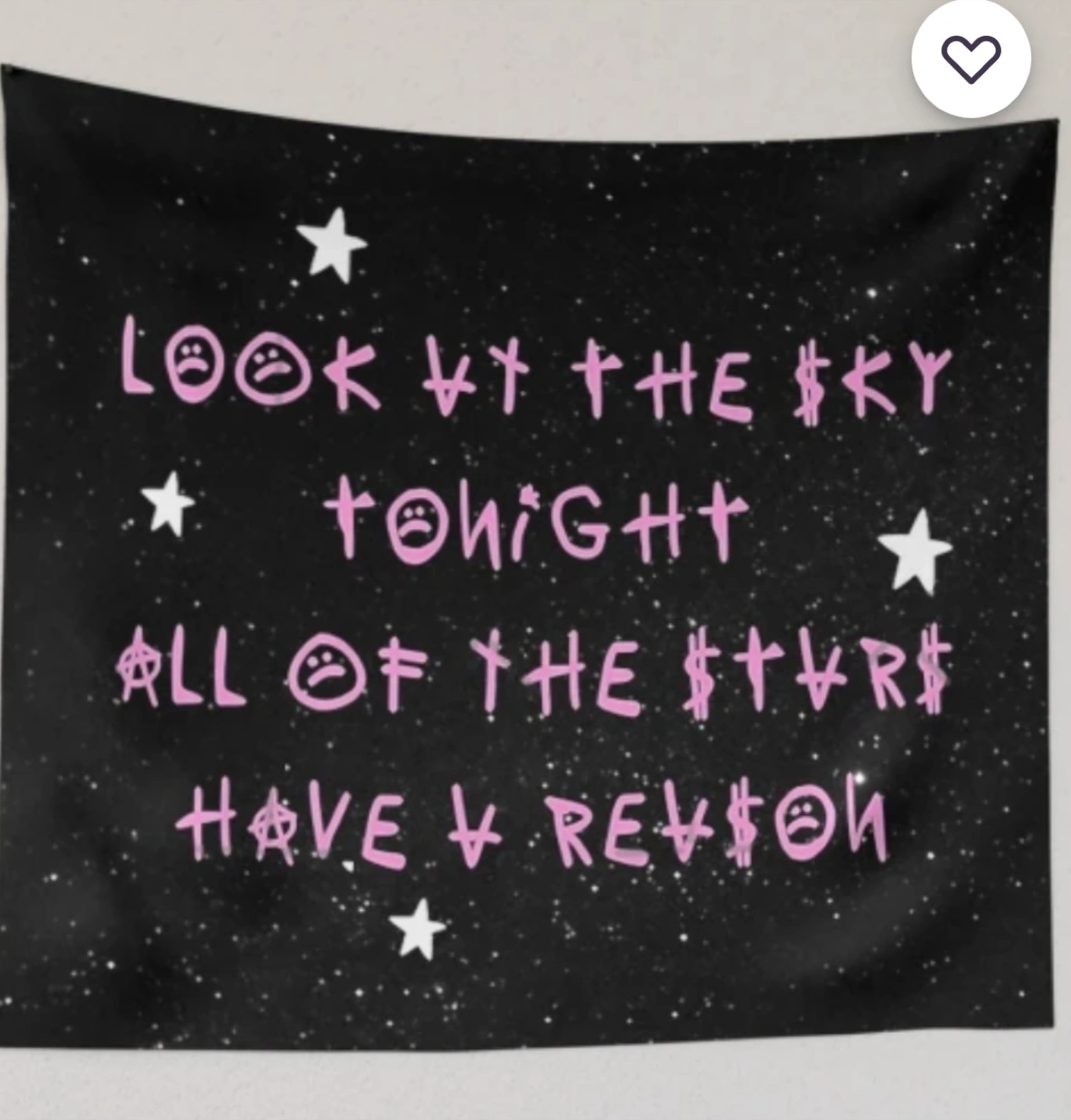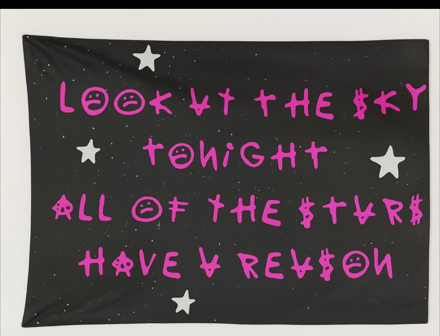This wall tapestry features the phrase "Look at the Sky Tonight All of the Stars Have a Reason" in pink lettering against a black background with white stars. It's perfect for adding a unique touch to any room! Why You'll Love It: A perfect collectible for Lil Peep fans or anyone who loves dreamy, aesthetic décor. The starry background and vibrant lettering make it an eye-catching piece for your bedroom, dorm, or lounge space. Add a unique and emoional vibe to your room with this Lil Peep-inspiring "Star Shop', featuring lyrics from lis song: • Size: 3 ft x 5 (36" x 60') • Material: Soft, lightweigt pólytester • Colors: Black with pink lettering & white stars • Condition: Gently used, clean, no tears or stains Cold gentle machine wash, line dry or tumble dry low, do not iron or bleach