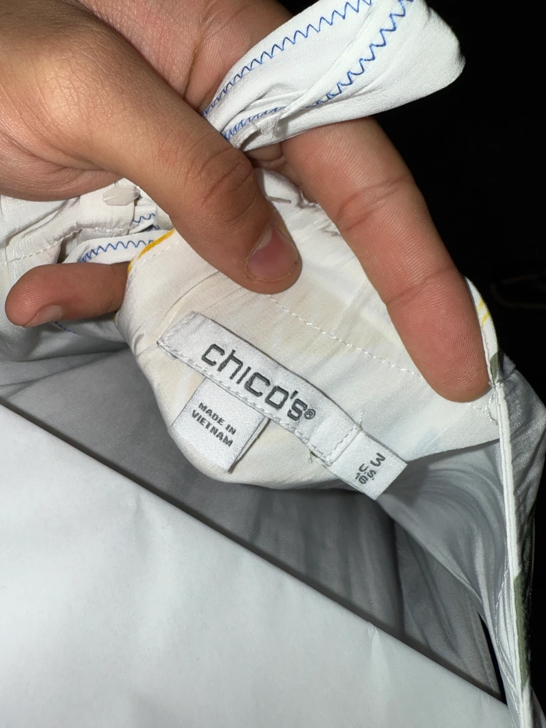 This is a Chico's maxi dress in size 3W. It features a colorful tropical print with blue, green, yellow, and purple hues. Perfect for a summer day!