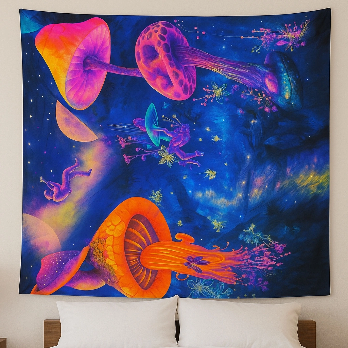 Add a touch of cosmic charm to your space with this vibrant mushroom tapestry! The colors are super eye-catching, and the design features floating figures among glowing mushrooms and stars. Perfect for adding a unique and dreamy vibe to any room Turn your space into another dimension with this trippy, cosmic-inspired tapestry featuring floating astronauts, glowing mushrooms, and vibrant galaxy tones. Perfect for anyone who loves bold art, festival vibes, or boho room décor. ✨ Details: • Size: 3 ft x 5 ft (36” x 60”) • Material: Soft, lightweight polyester • Colors: Deep blue, neon pink, purple, and orange • Condition: Excellent, clean, no rips or stains • Use it as: Wall hanging, bed backdrop, or festival décor