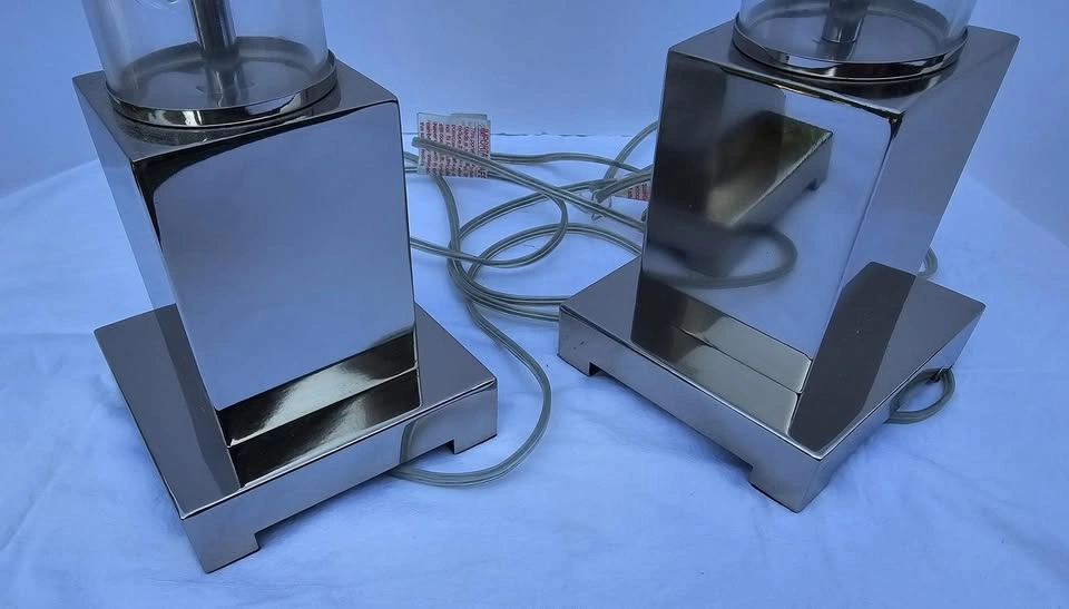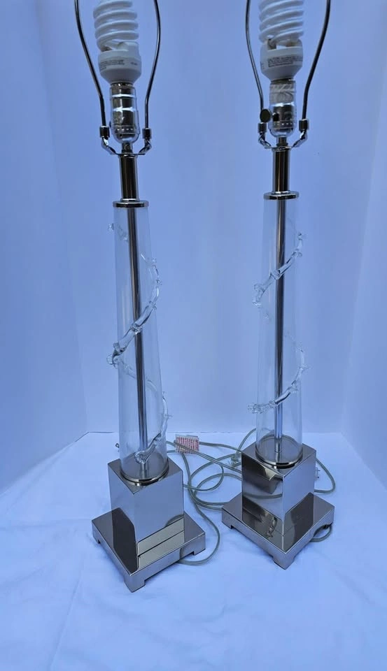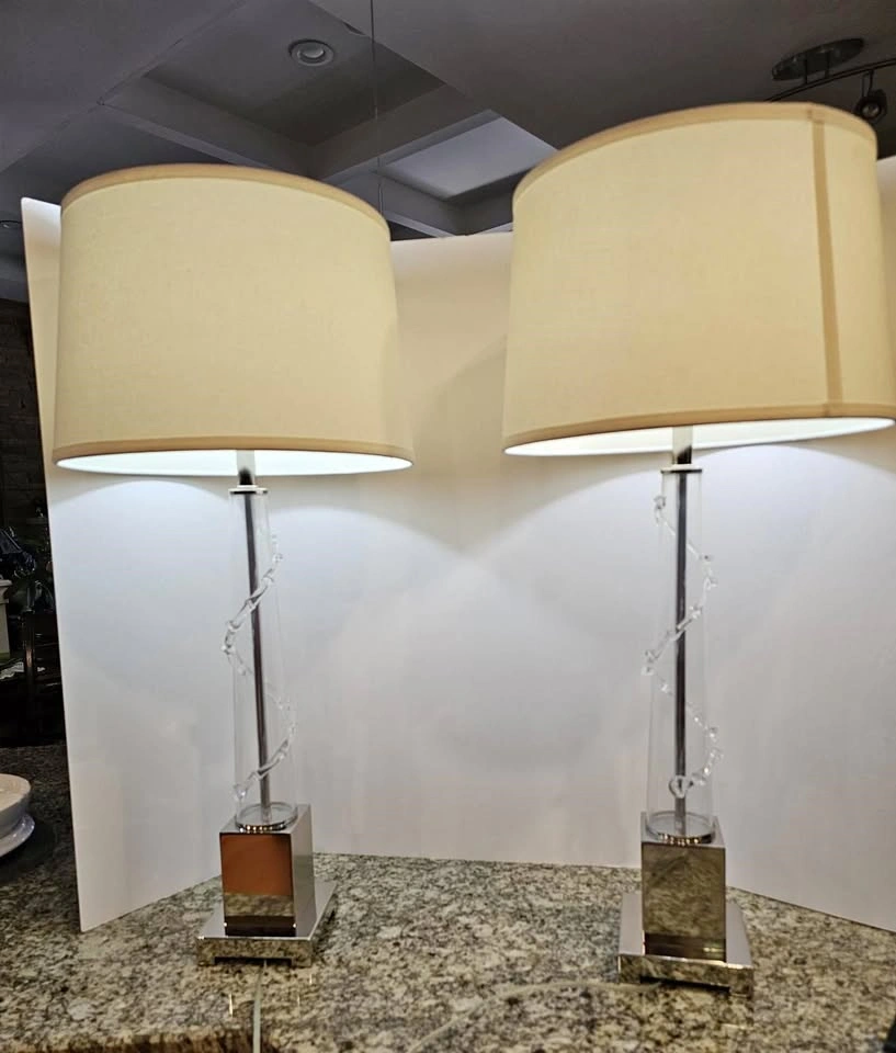 10Uttermost 26556 Vetro Glass Table Lamp Set Features: Material: Metal, Glass, Fabric Voltage: 110 Finish: Clear Glass Cone With A Beaded Spiral Accent And Polished Chrome Plated Details. Number of Lights: 1 Shade Description: Round, slightly tapered hardback made of fabric. Shade Size: Height: 10.5, Top: 14W x 14D, Bottom: 16W x 16D Wattage: 150W Cord" 78" Country of Origin: China Item Dimension: 16 D x 16 W x 35.75 H in. Weight of each lamp 6 pounds 11 ounces CASH ONLY AT PICKUP
