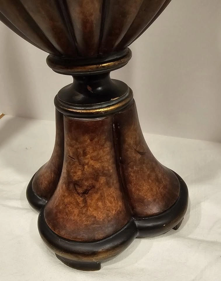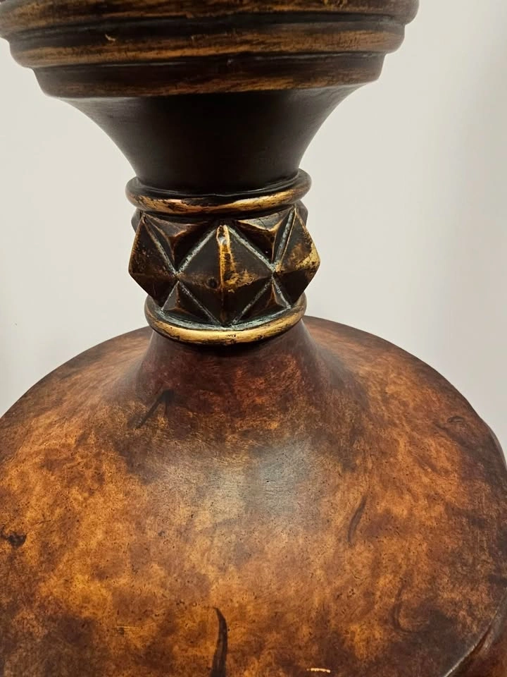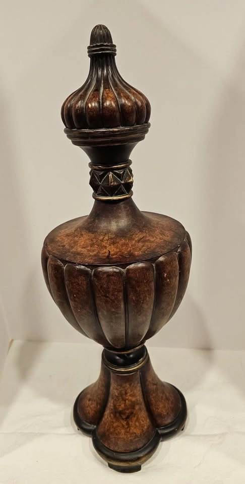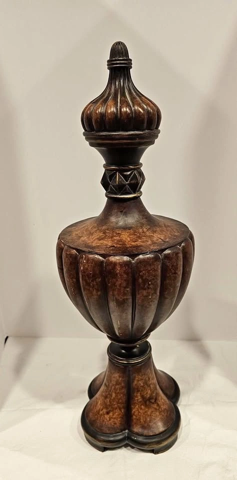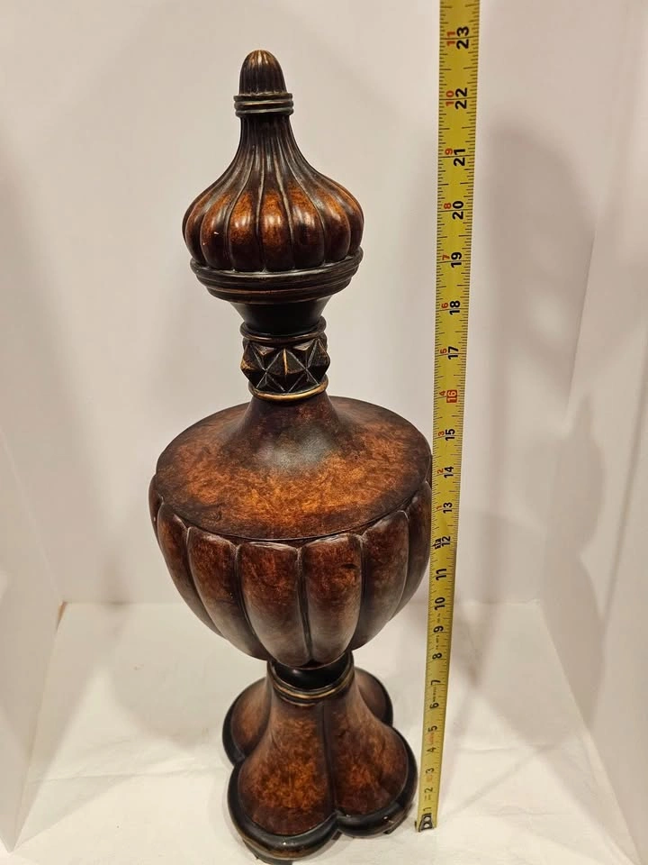 10Large Piece made of Wood Look Resin with gold accents around the rings and black around the base. Large/Tall Bishop Chess Piece High Quality Resin. Measures 23 inches Tall Wood Look Very detailed piece. 23" Tall 7" round at widest point 7 1/2" footed base feet 1/2" tall Weight unboxed 7 pounds 11 ounces CASH ONLY AT PICKUP
