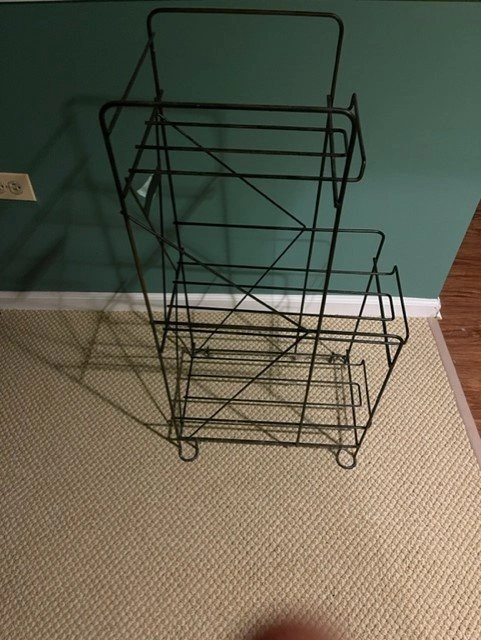 10Black MCM Magazine Rack with 3 shelves. It's 33" tall by 10 1/2". The top shelf is 10"x 11 1/2", the middle is 10 1/4" x 17", and the bottom is 10"x 17". In good condition. MCM Black Metal Magazine Rack. CASH ONLY AT PICKUP