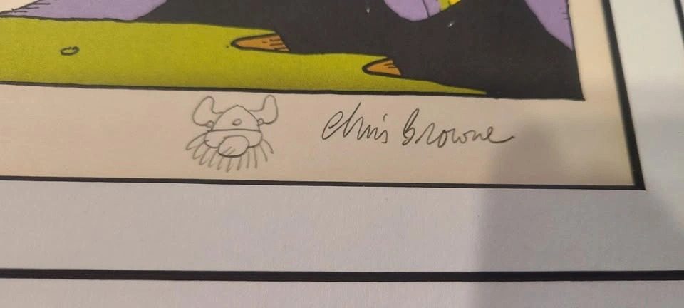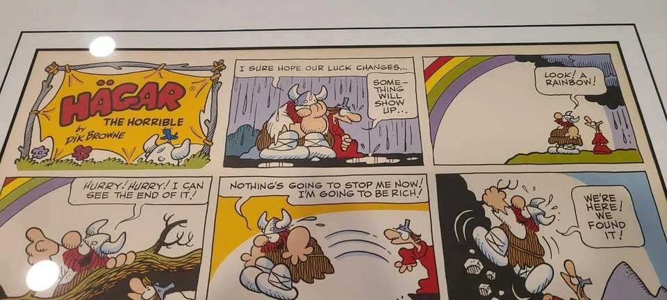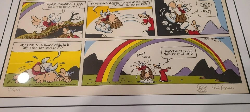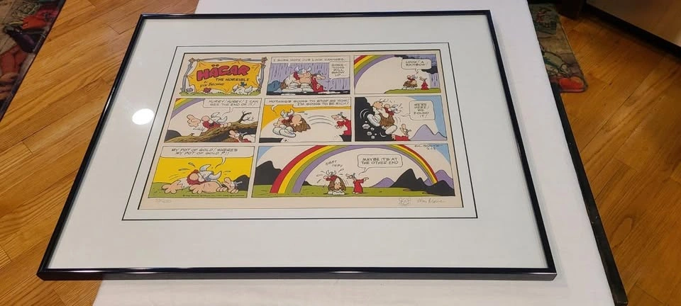 10RARE Hagar The Horrible All Colored Comic Strip Signed By Chris Browne Full Color Comic Strip Signed by Chris Browne with Hagar Head and this is a numbered 33/450 Includes the Certificate of Authenticity by Classcom Inc. Framed and Matted. Frame is Black Metal 24" x 19" x 1" The comic is dated 1977 but the COA envelope states this was done in 1992.