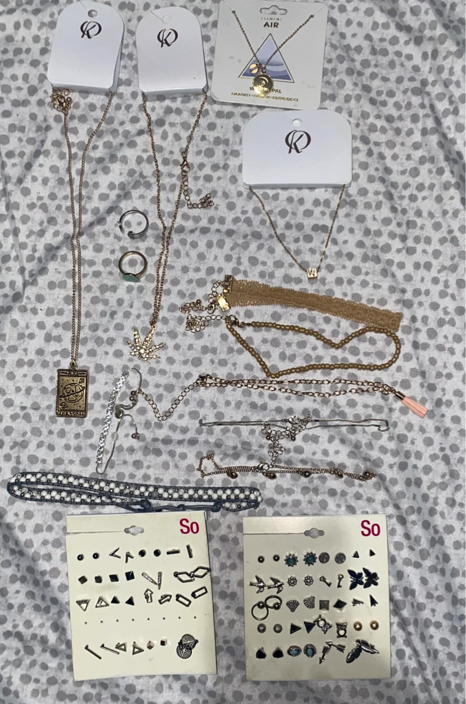 984- Necklaces (unused) 2-rings ( pretty good conditions) 1- lace chocker 4- Chocker style necklaces 1- Silver bracelet 1-beaded bracelet 72 earrings ( unused) Method of payment preferably cash :)