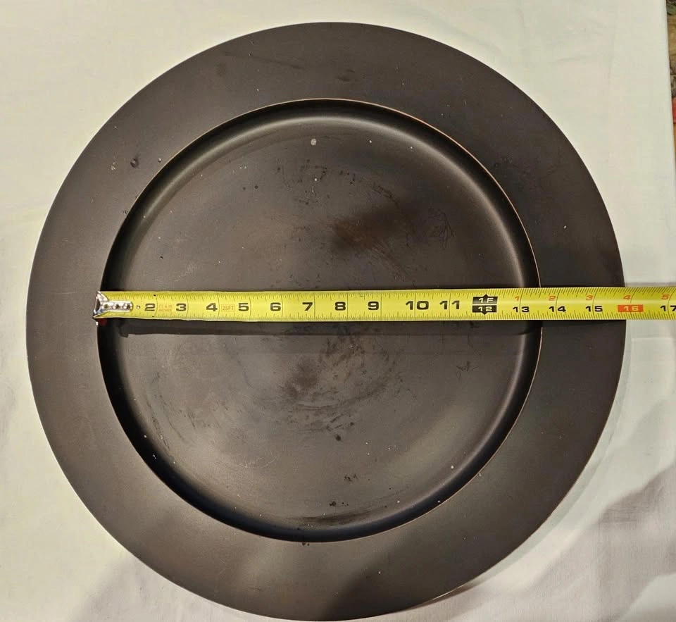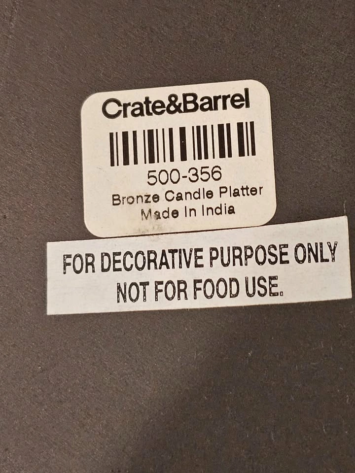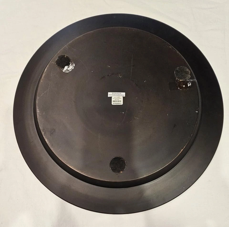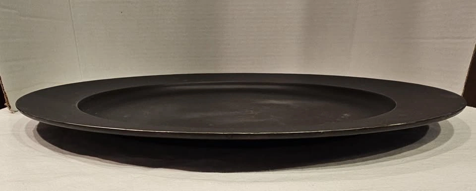 10Hard to find piece from Crate & Barrel. It has been used and does have some candle wax marks. Bronze Metal Candle Platter. Marked on back 500-356 Bronze Candle Platter Made in India For Decorative Use Only NOT FOR FOOD USE Three felt pads on the bottom that have moved from candle heat. Measurements Large 18 1/4" Diameter 13 1/2" Center and 1/2" Deep Overall height 1" Weight 4 pounds 2 ounces Please see photos, questions please message before purchasing.