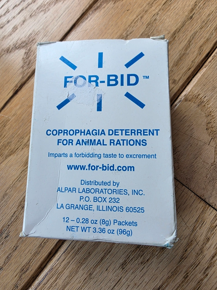 I'm selling a box of FOR-BID Coprophagia Deterrent for Animal Rations. It imparts a forbidding taste to excrement. The box contains 12 - 0.28 oz (8g) packets. Ingredients include wheat gluten and monosodium glutamate Pick up in Naperville near naper blvd and 87th street or near downtown Naperville off of Chicago and Charles