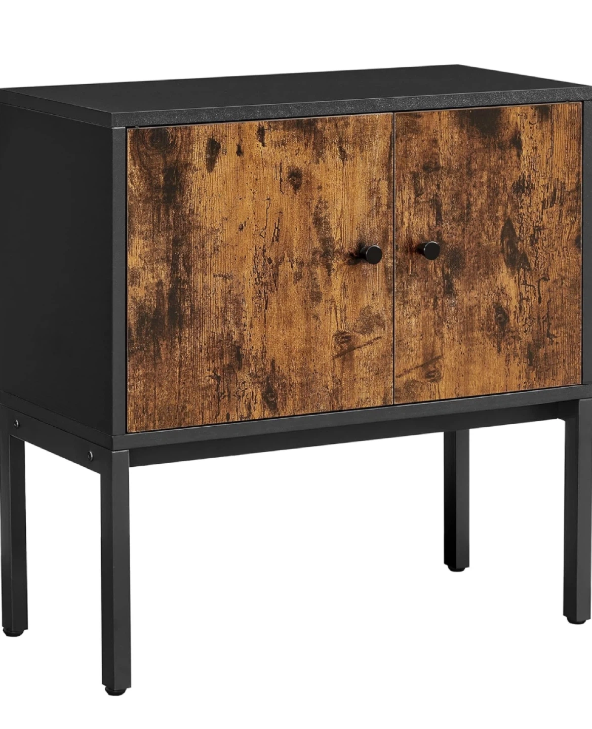 This is a VASAGLE side cabinet in brown and black. It features a cabinet with two doors and stands on black metal legs. The dimensions are approximately 23.6" x 11.8" x 23.6". It's a stylish piece that could be used in various rooms!