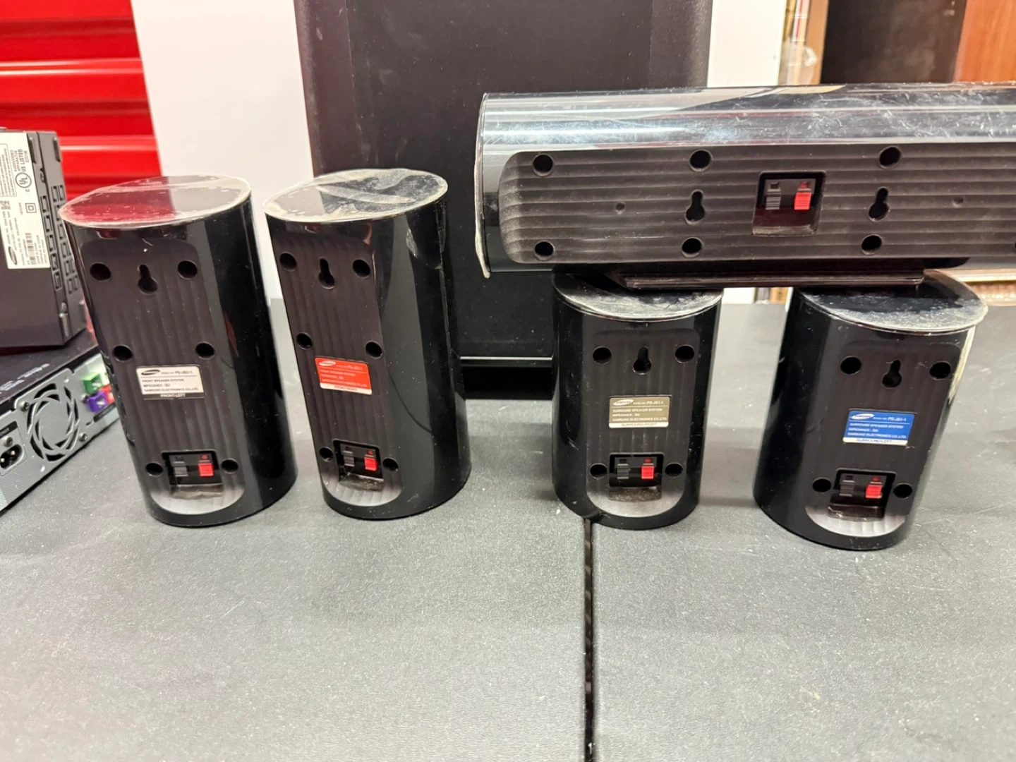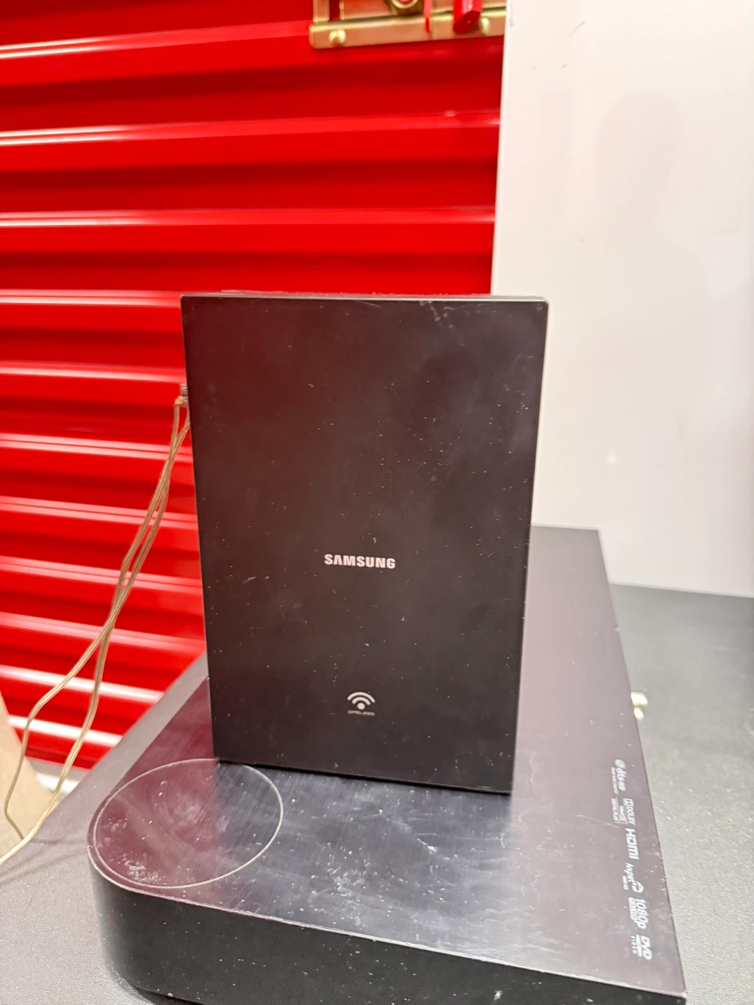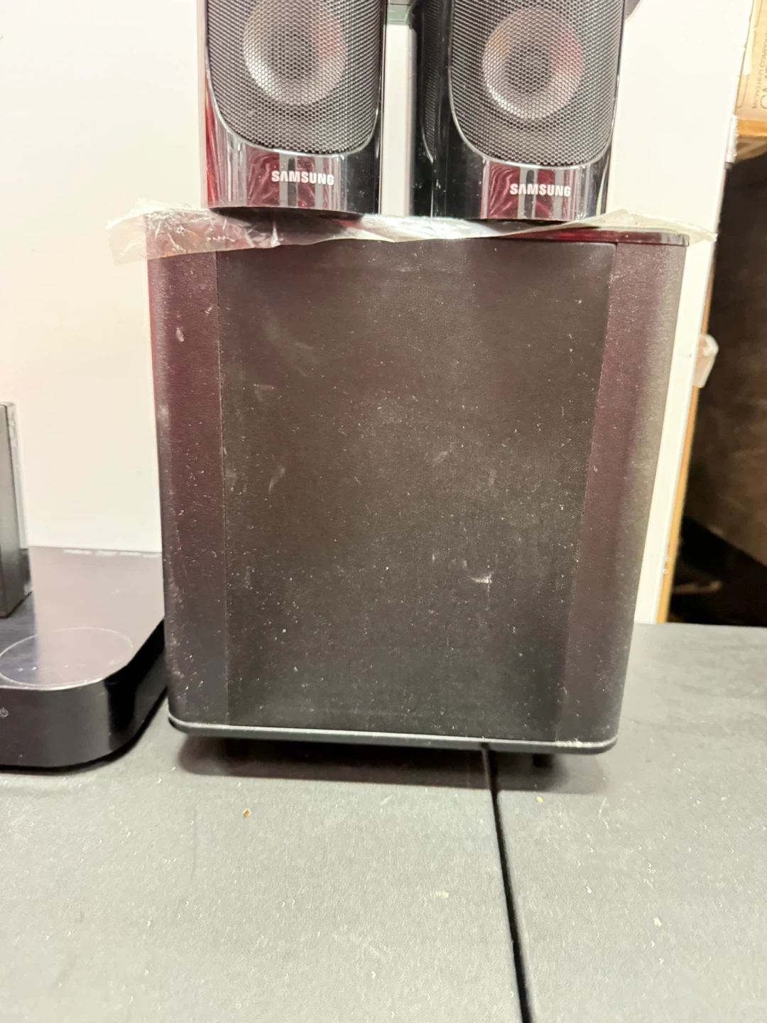 Selling a used Samsung home theater system. Includes a Blu-ray 3D player, subwoofer, and multiple speakers to create a surround sound experience. Perfect for movie nights or listening to music!