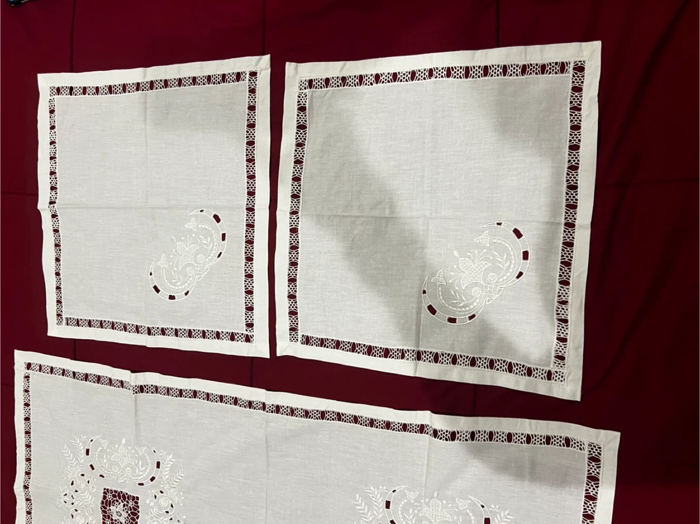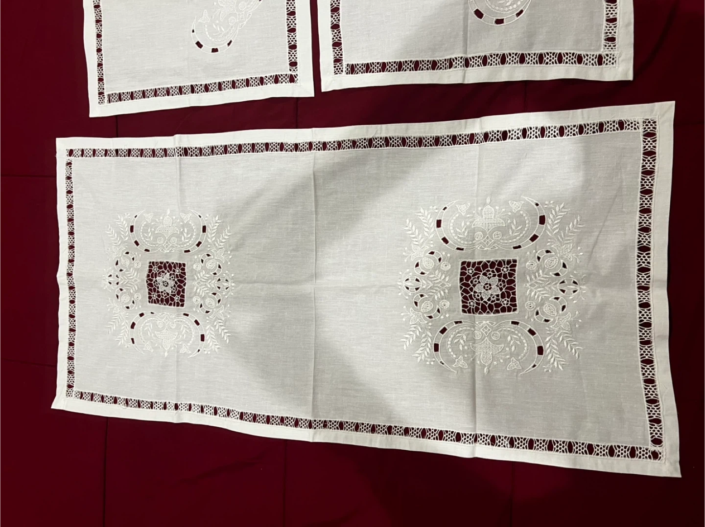 10Selling a beautiful set including a table runner and two placemats. They feature intricate white embroidery and a delicate border design. Perfect for adding a touch of elegance to your dining table!
