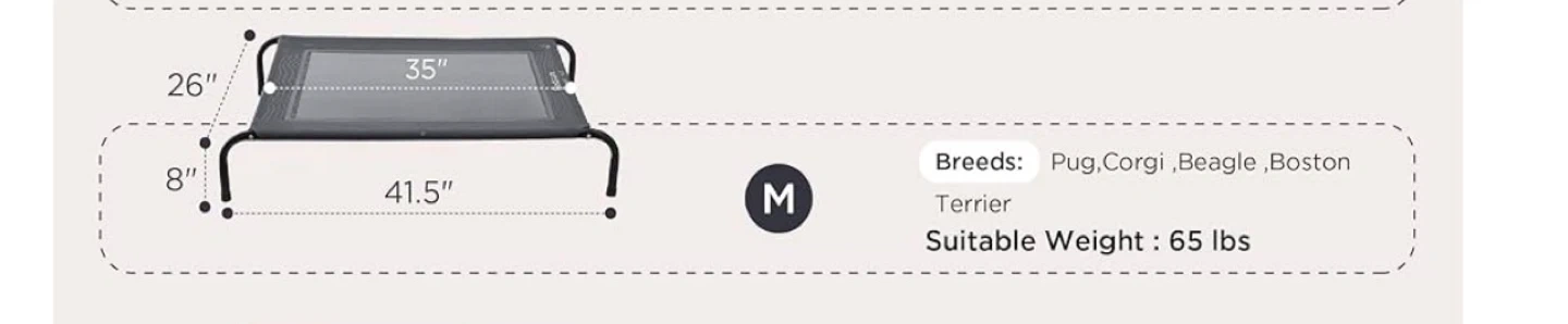 ELEVATED COMFORT: Bedsure Elevated Dog Bed (8" Off the ground) lifts your doggy pal off wet, muddy grass to keep him clean and cool, especially on rainy or hot days - Durable Teslin (recyclable and non-toxic) mesh allows air to flow right through the fabric and he/she will be feeling the breeze in summer - Can ease the stress/pain on your pet’s joints. DURABLE DESIGN: Well-built frame helps the pet bed stable and safely elevated for your dog to rest easy on - Durable sleeping surface supports your pets comfortably and resists rips from claws - Equipped with skid-resistant feet, our elevated dog bed protects your floors from scratches and keeps the bed from sliding when your dog jumps on or off. DIMENSION & CARE: Medium Raised Dog Cot: 105L x 65W x 20H cm (Frame), 89L x 64W cm (Mesh), up to 65 lbs (30 kg). Perfect for all breeds and ages of dogs and cats (easier for older pets to hop on/off). Easy to clean: Pet hair and dirt don't cling to the tight mesh - just hose down (tap water only) or hand wash with mild soap and air dry. 📍pickup in Thorold
