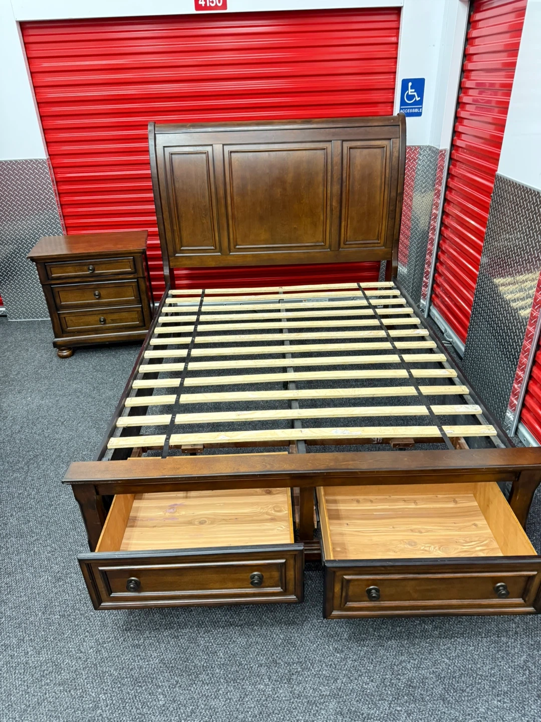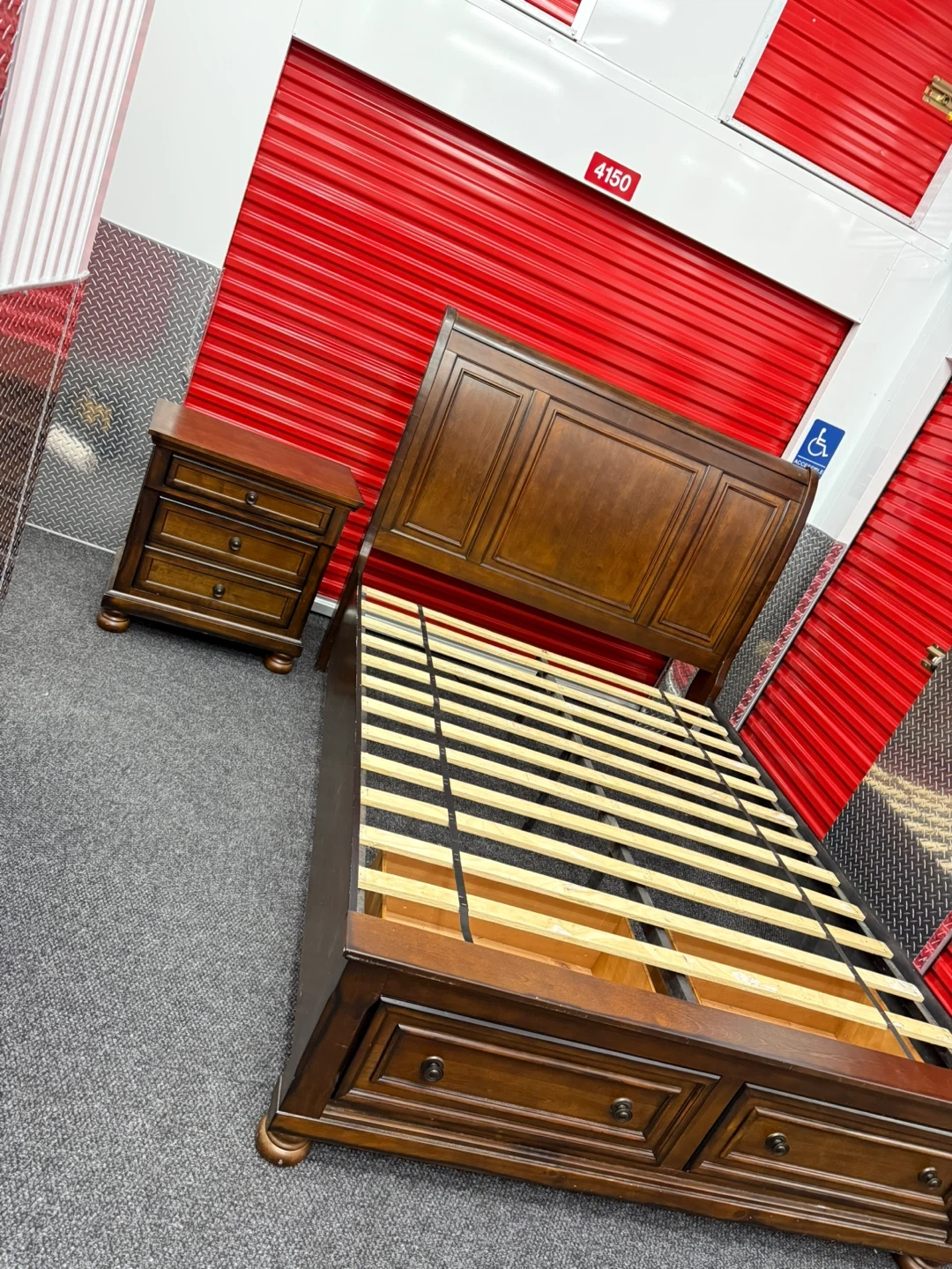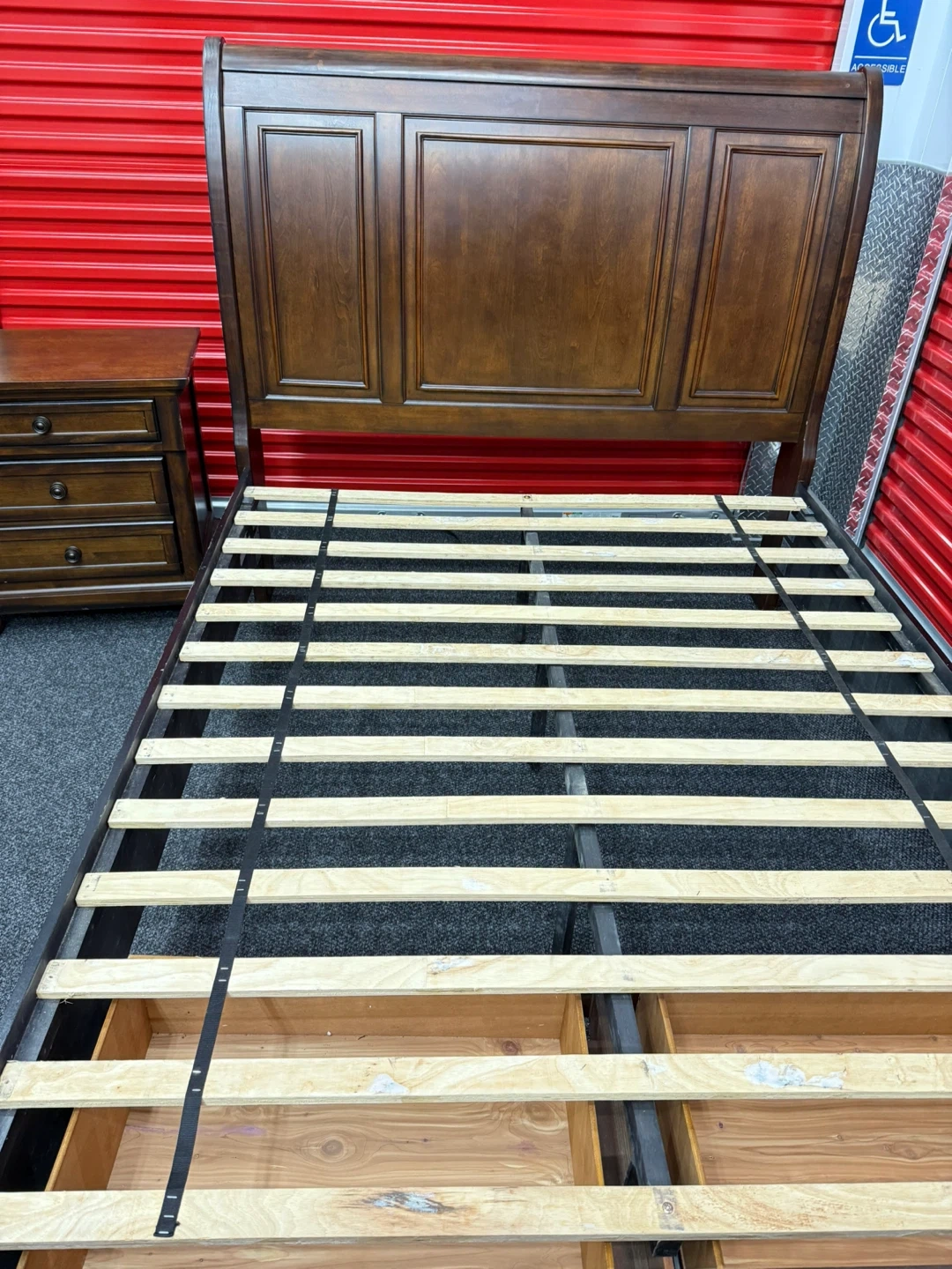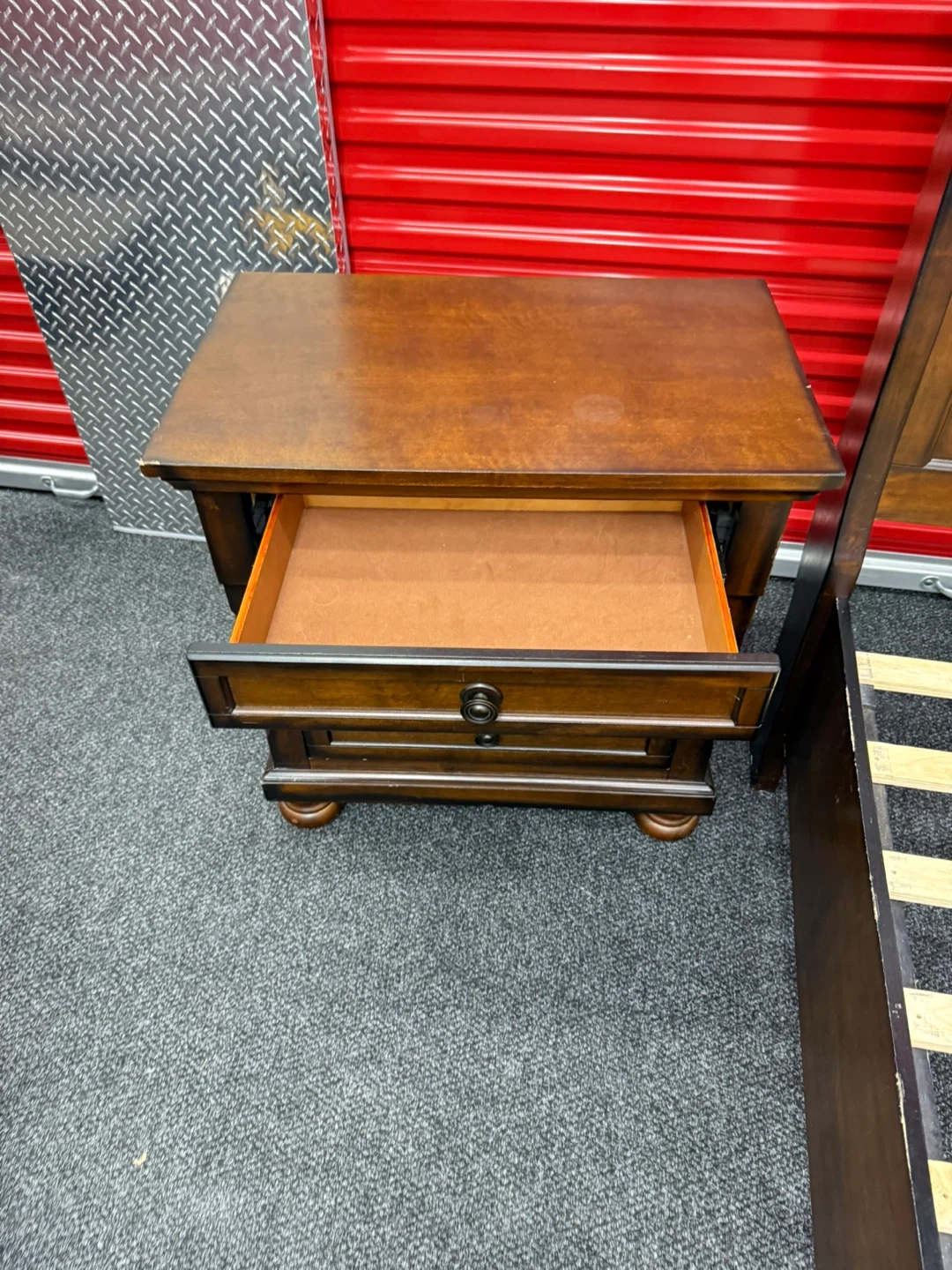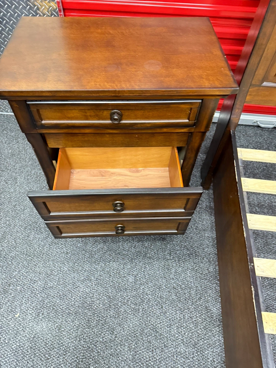 Selling a wooden bed frame with a matching nightstand! The set is in good condition and features a classic design with a warm, brown finish. The bed frame has a sturdy construction and the nightstand offers convenient storage with its drawers.