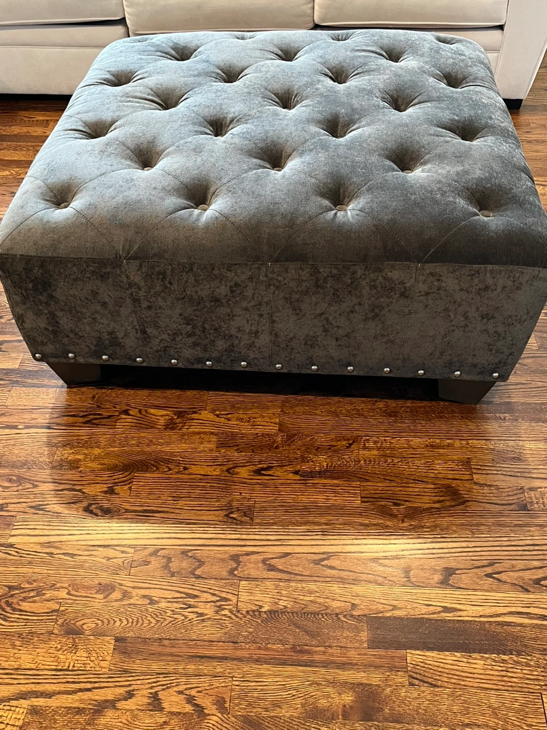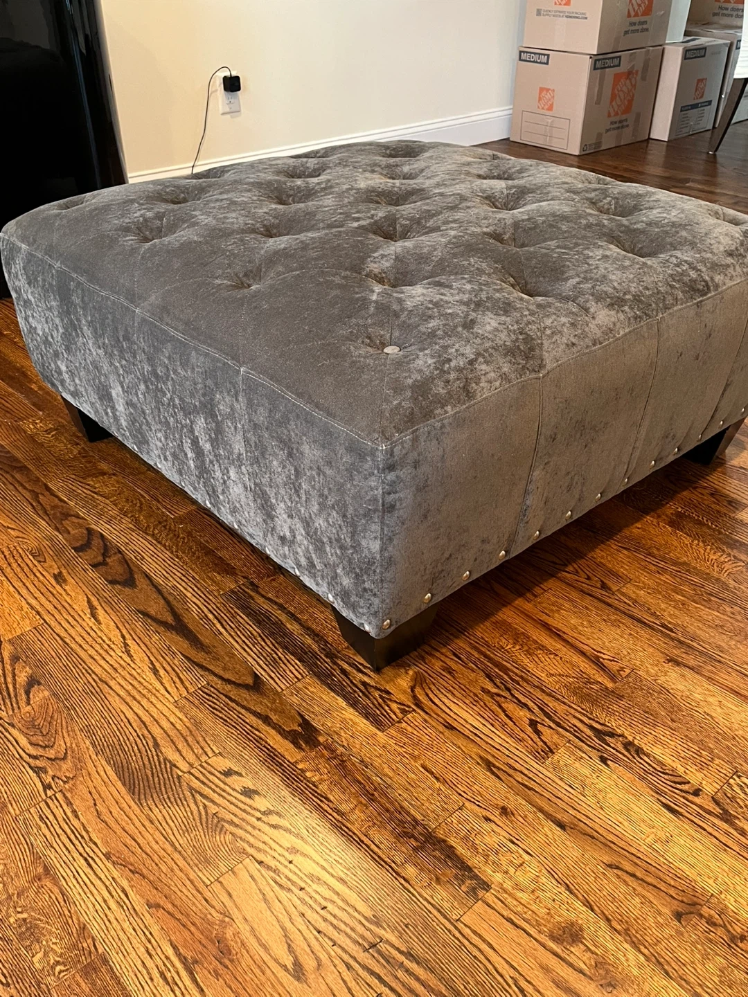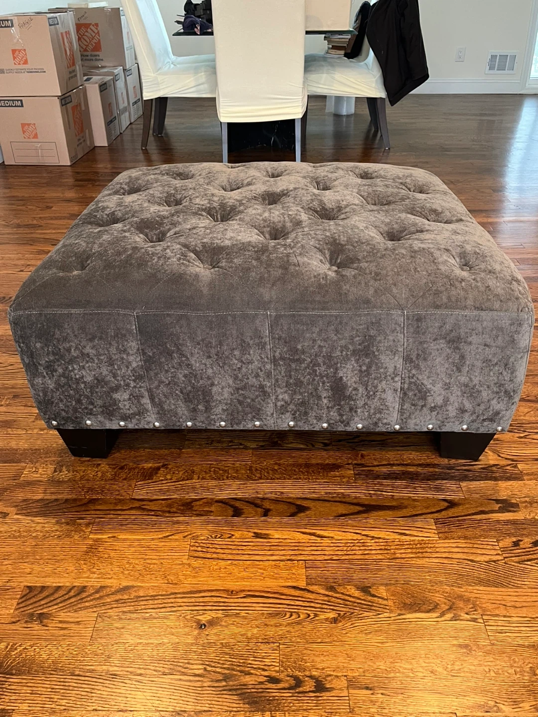 Selling a tufted ottoman in a neutral gray color. It's in good condition and would be a great addition to any living room or seating area. The ottoman has a classic design with button tufting and a soft, comfortable surface. It could be used as a footrest, extra seating, or even as a coffee table with a tray on top