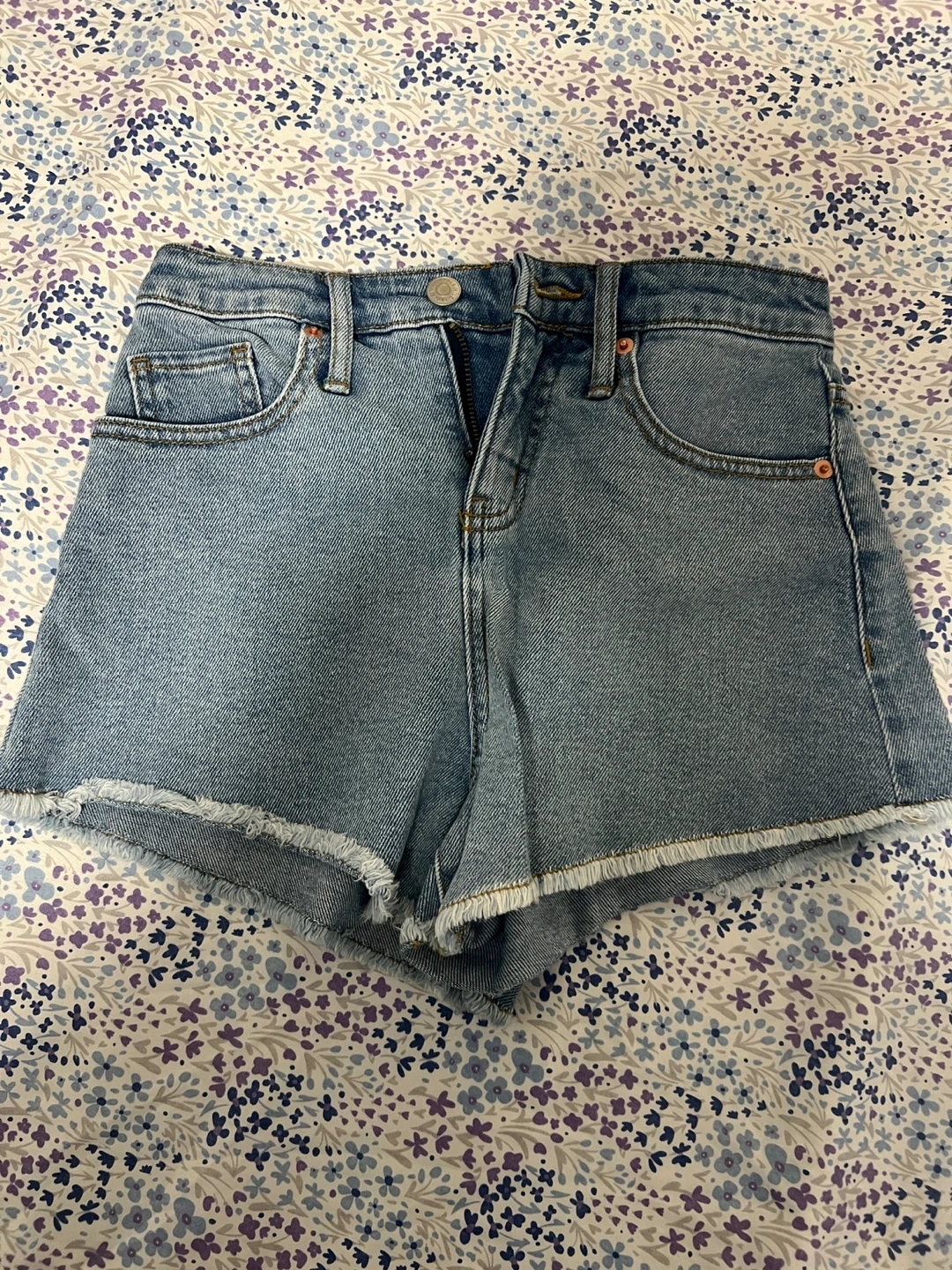 20These are a pair of denim shorts. They are a light wash with a frayed hem. They appear to be in good condition
