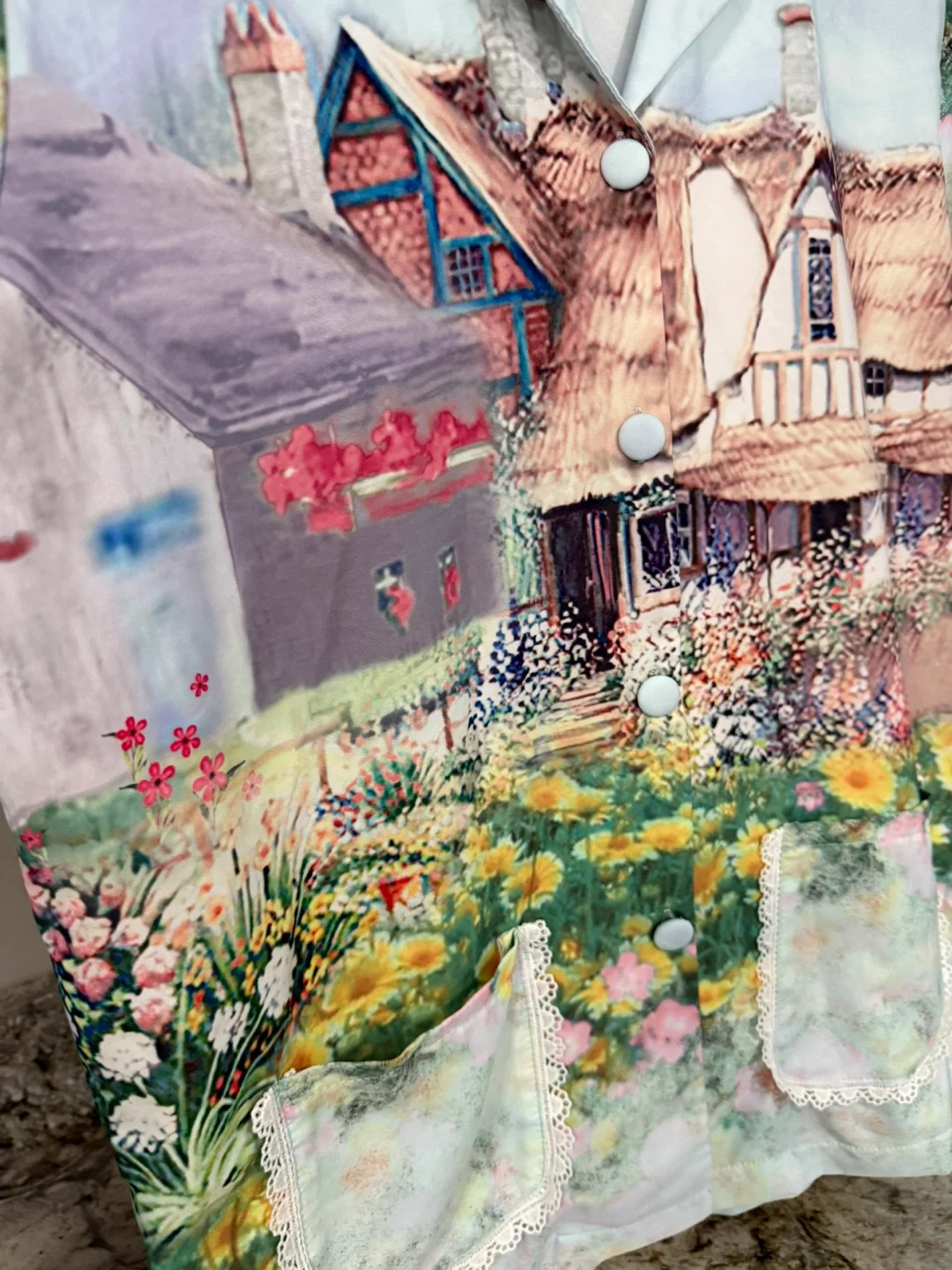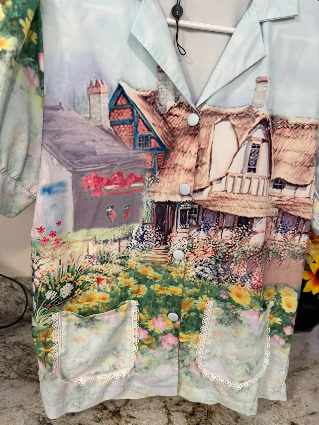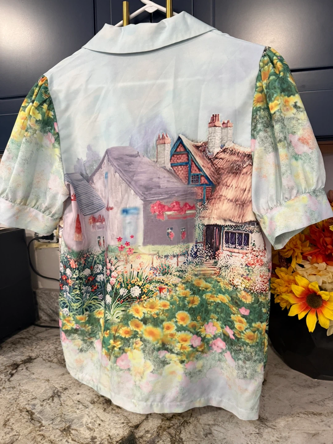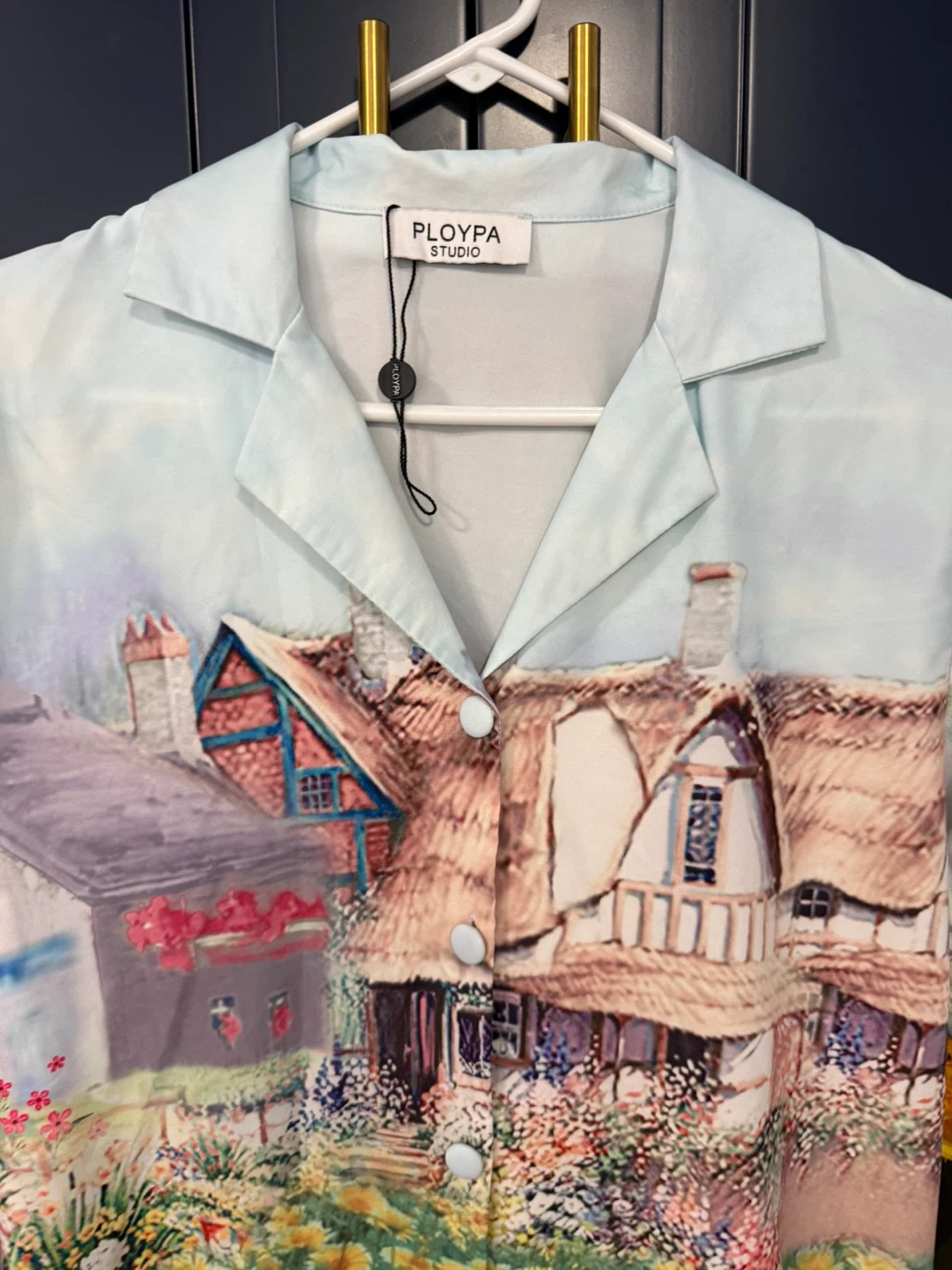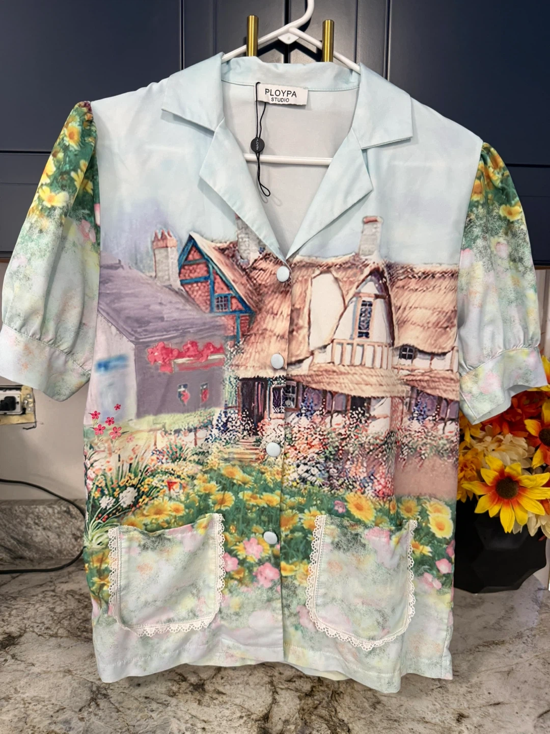 Good Selling a PloyPa Studio shirt featuring a charming cottagecore design. The shirt has short sleeves and a button-up front. It's in great condition and ready for a new home!