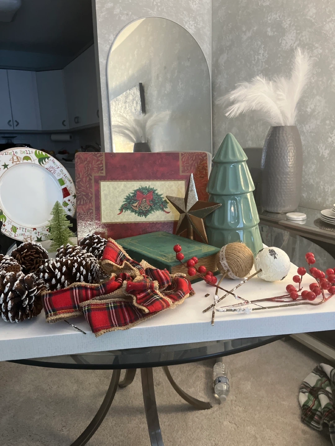 12” 2 pc. Ceramic cookie jar Pine cones dipped white (6) Dark green faux book (box) 1 hard placemat 2 Christmas plates 12” ( great to gift with homemade cookies)!!!! 2 rustic ball ornaments. 3 hooky stems. 1 silver and copper colored star tree topper.