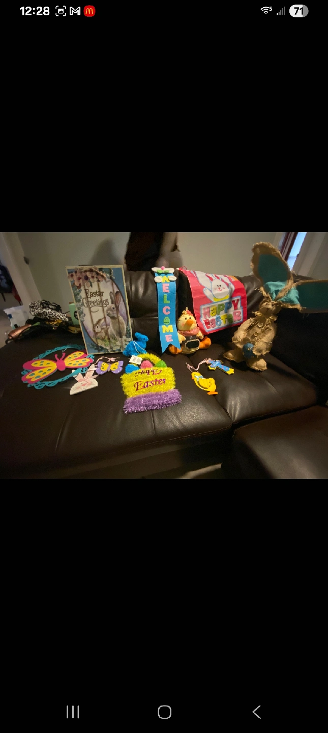10Selling a bundle of Easter decorations. Includes a picture frame, several hanging decorations, and a stuffed bunny. Perfect for adding some festive cheer to your home!