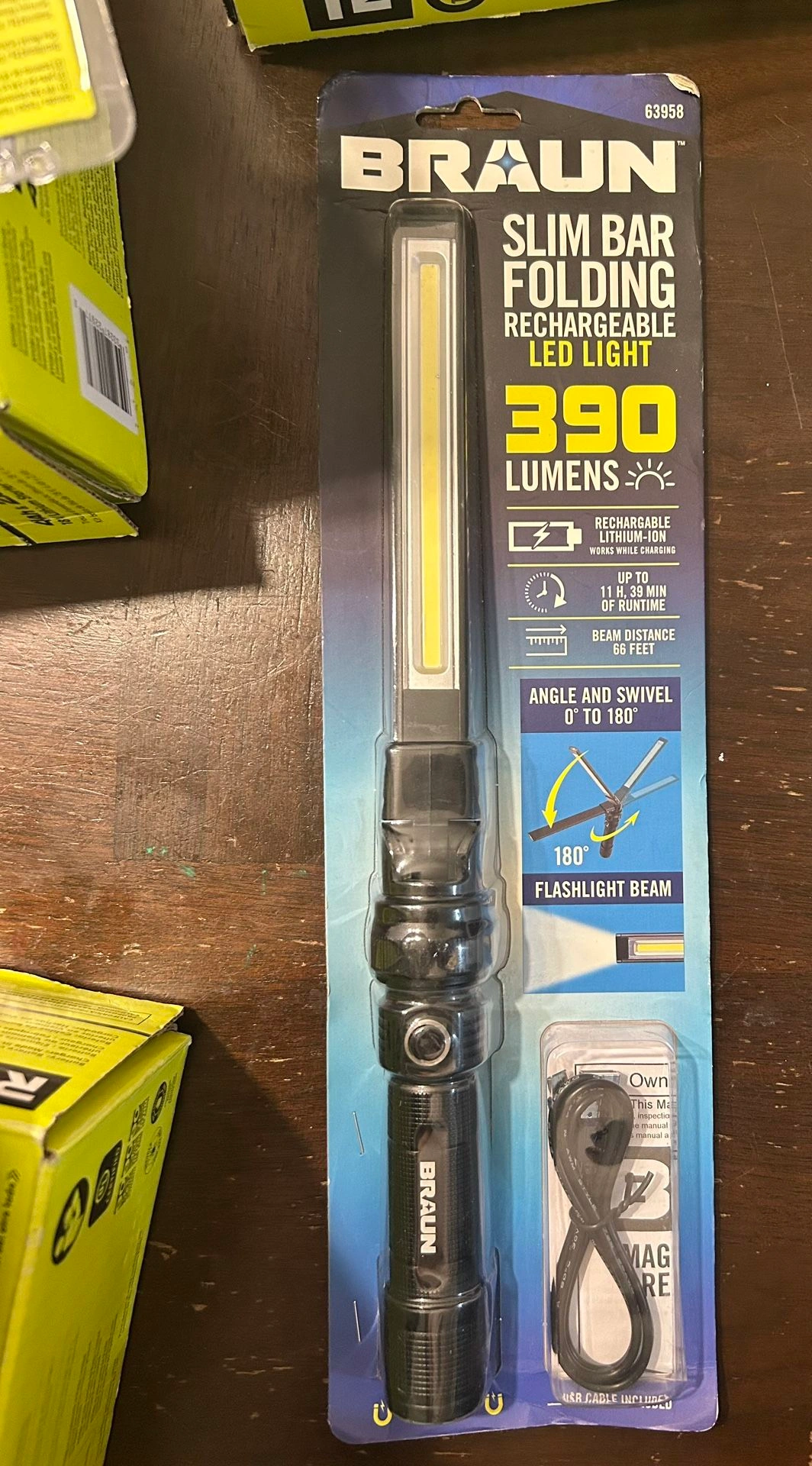 60Brilliant white LEDs for output up to 390 lumen. High/low modes for optimal battery life. Adjustable head can be angled to 180°. Head swivels 180°. Includes flashlight option. Rechargeable.