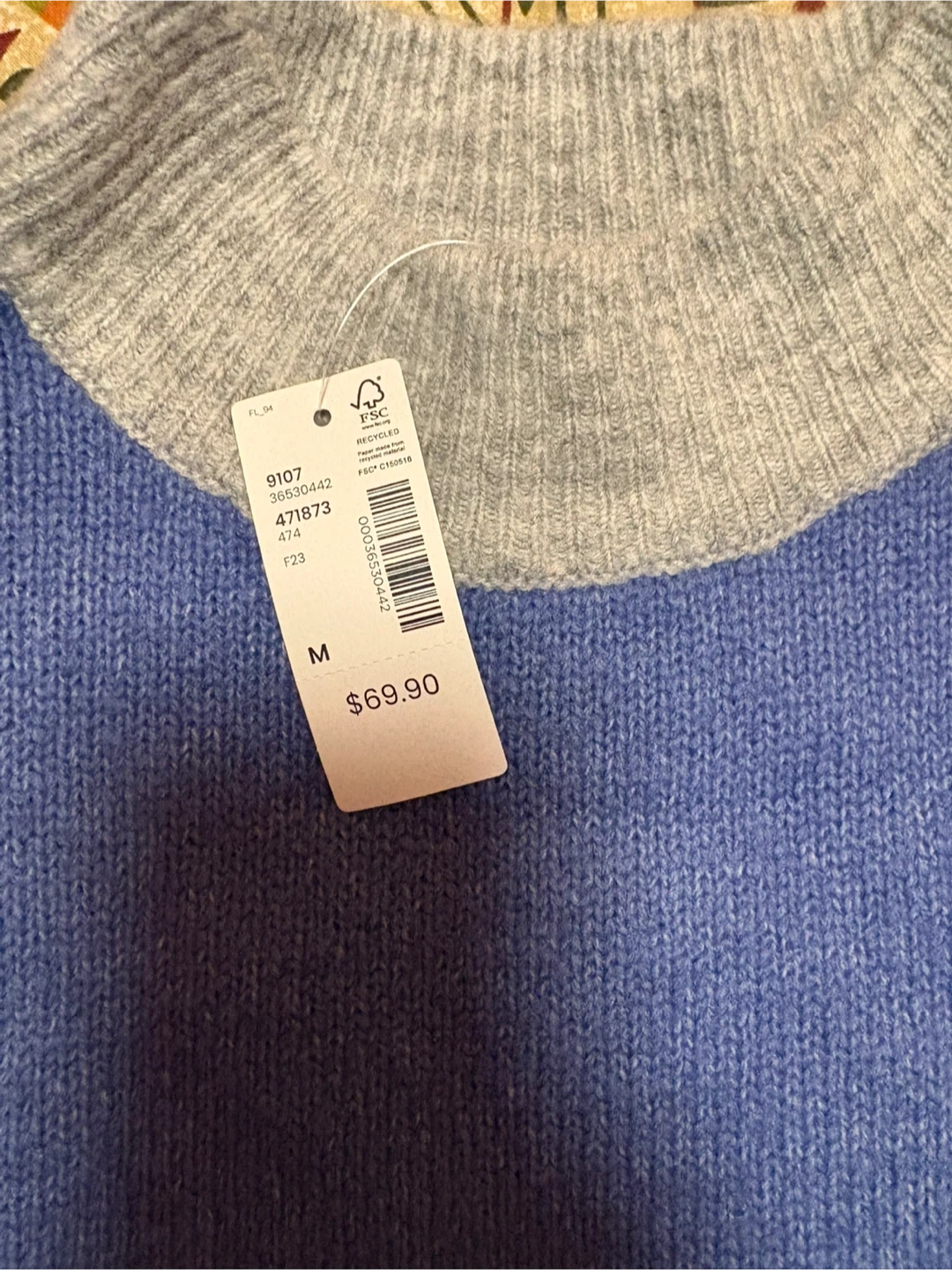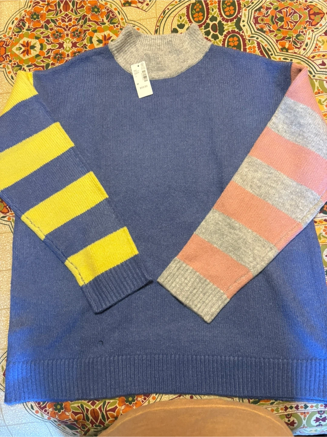 sweater featuring a unique colour block design with blue, grey, yellow, and pink stripes! It's a size medium and was originally bought for $69.90