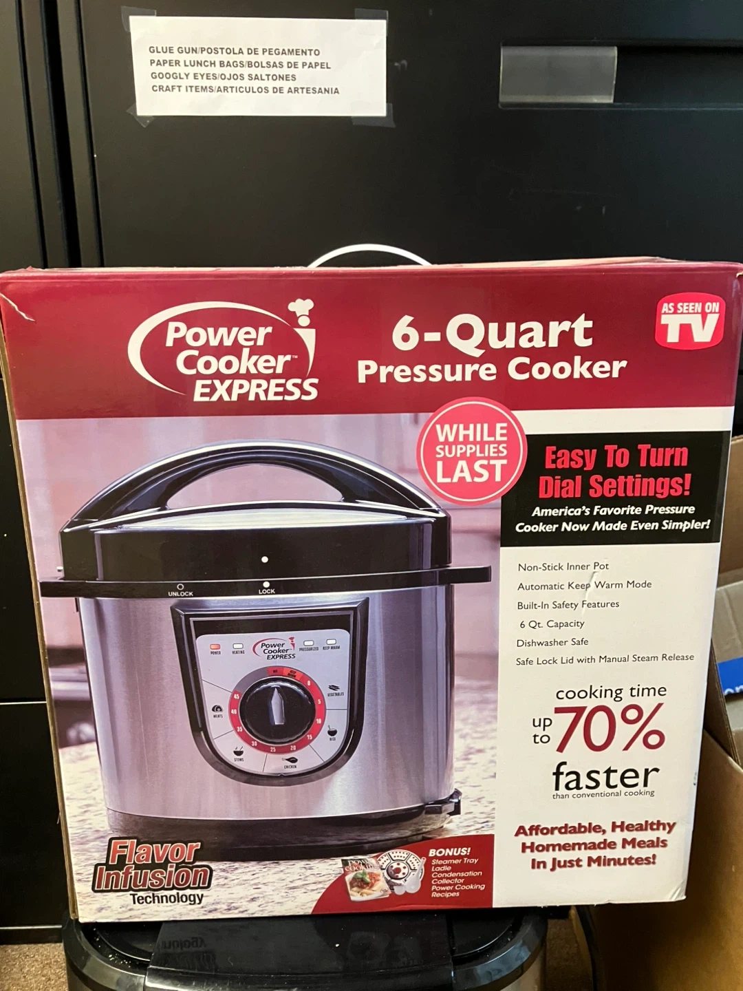 Selling a Power Cooker Express 6-Quart Pressure Cooker! This pressure cooker has easy to turn dial settings and cooks up to 70% faster than conventional cooking. It features a non-stick inner pot, automatic keep warm mode, and built-in safety features. It's also dishwasher safe and has a safe lock lid with manual steam release