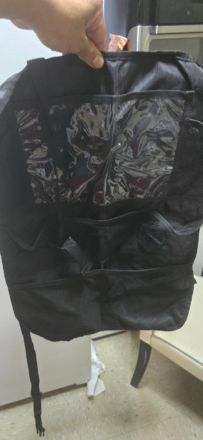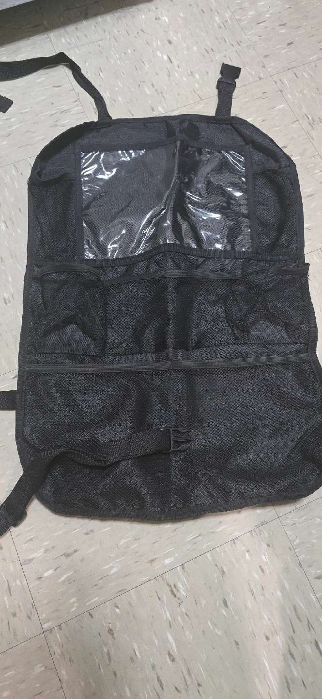 Selling a black car seat organizer. It's in great condition and ready to use! Perfect for keeping your car tidy and organized. It has multiple pockets for storage.