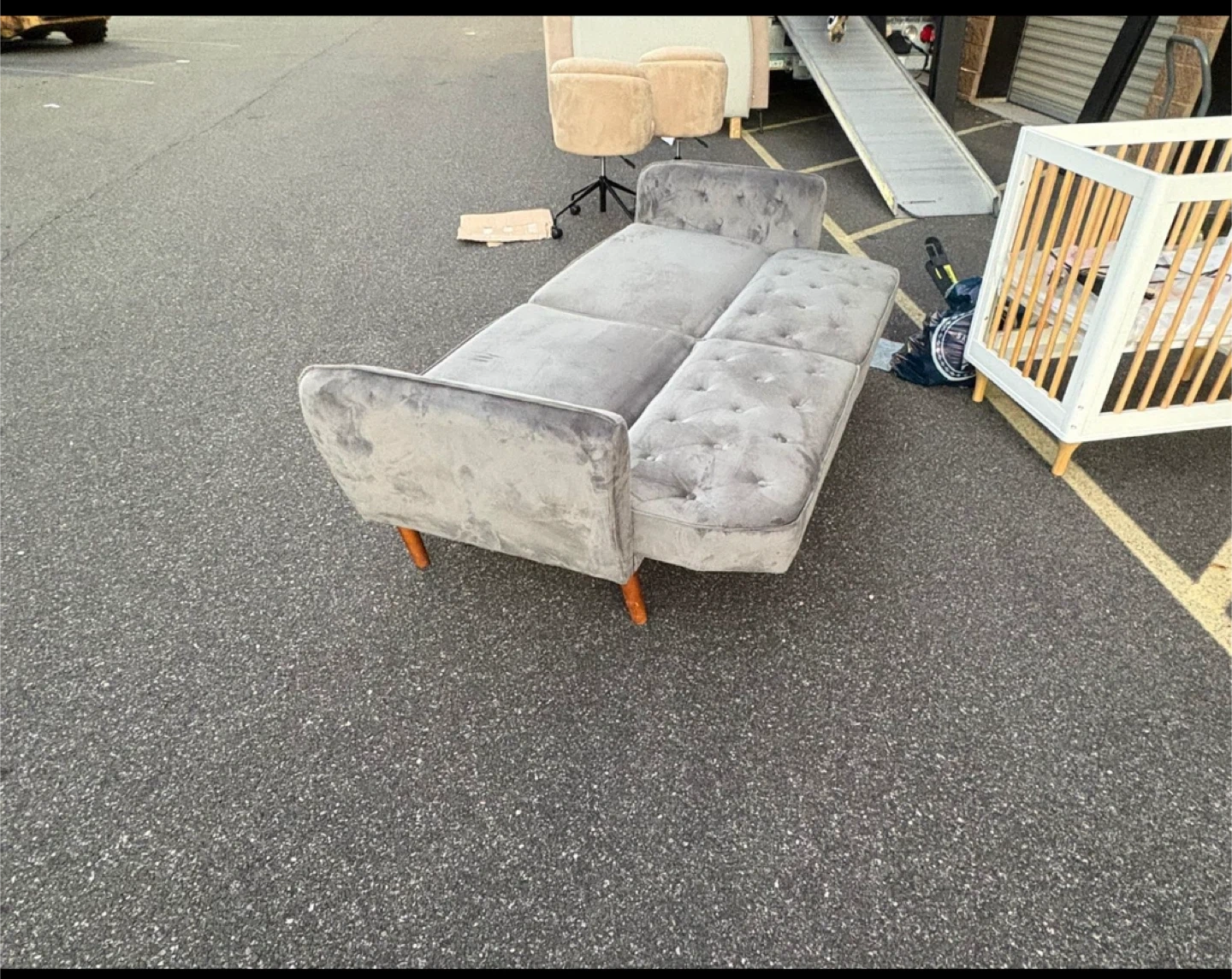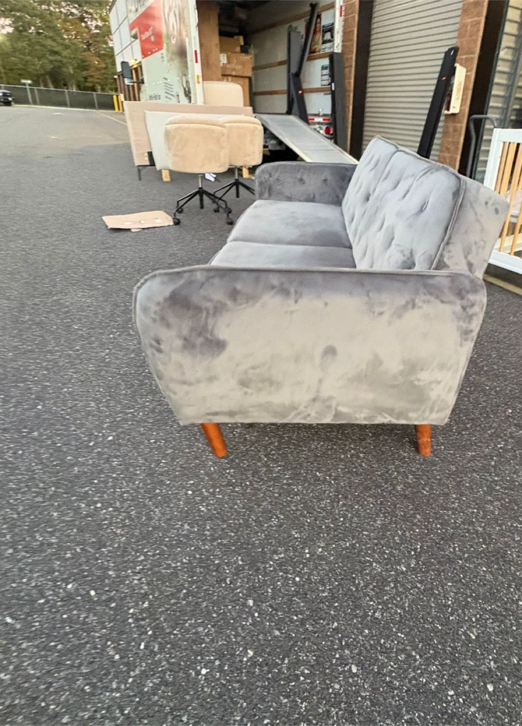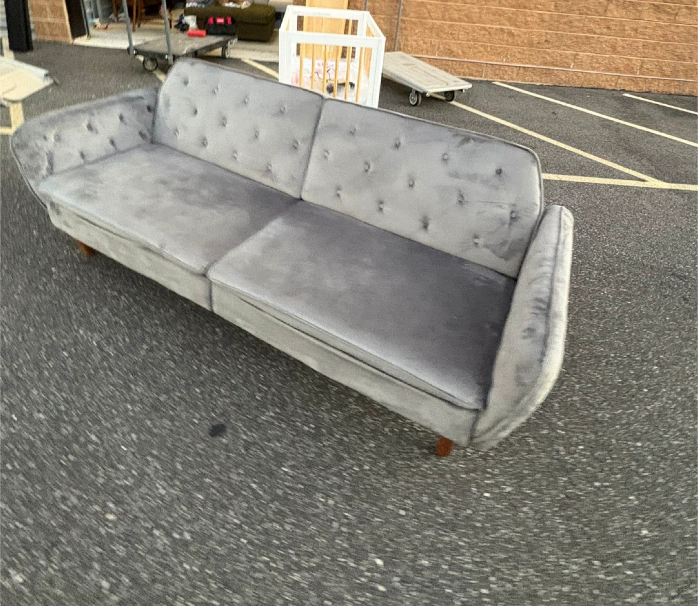 Selling a gray tufted velvet sofa. It features a button-tufted design and wooden legs. It's a stylish and comfortable addition to any living space!