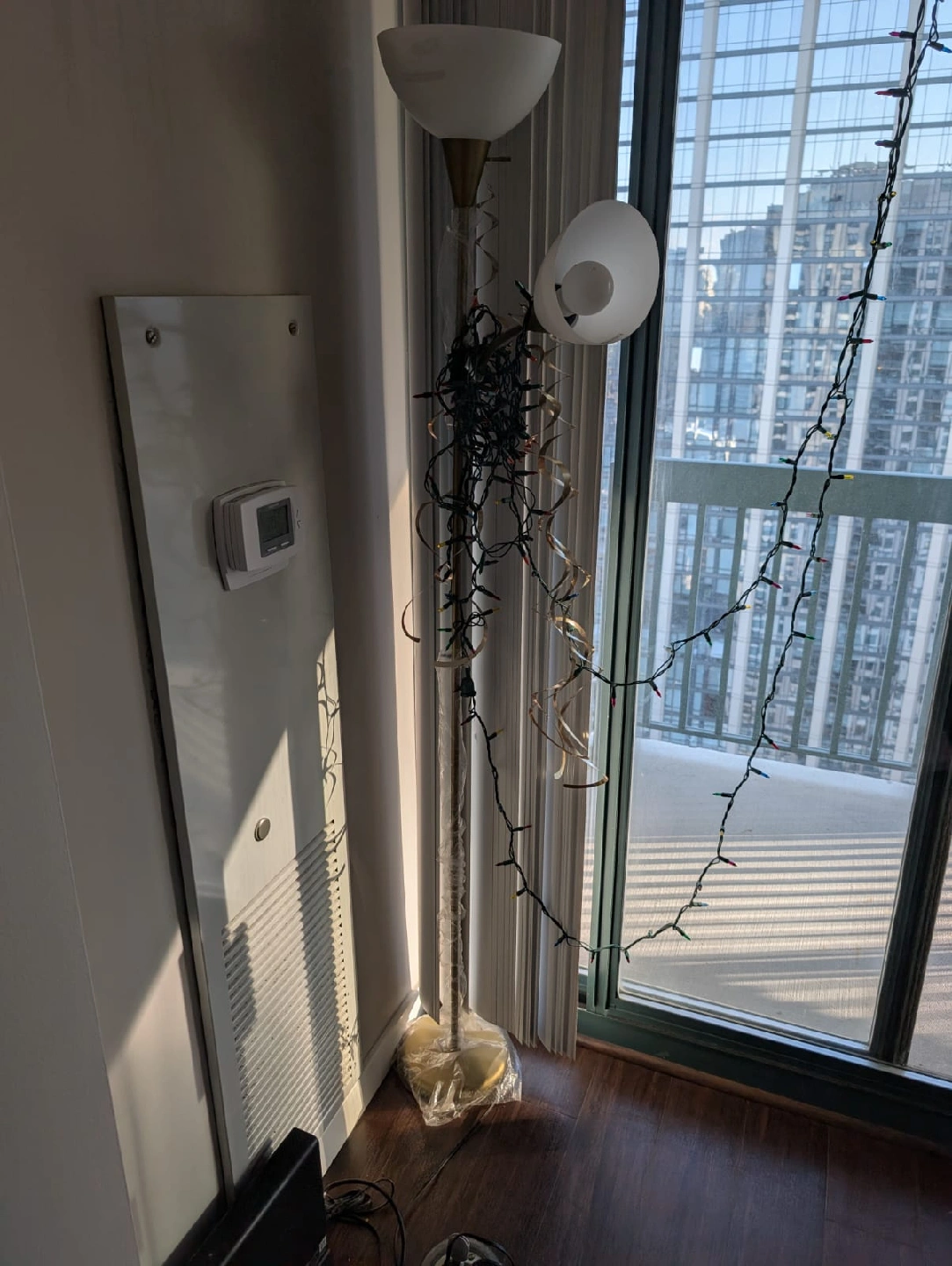 Floor lamp with built-in shelves! It's in great condition and would be a nice addition to any room. The black finish is sleek and modern, and the shelves are perfect for displaying books or other decorative items