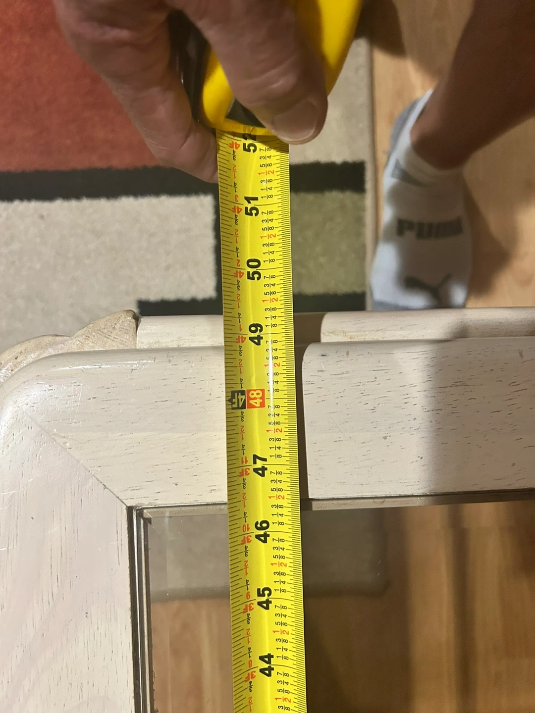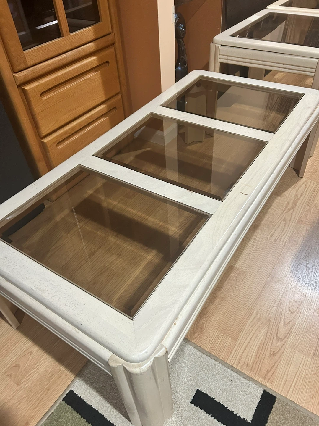 Selling a coffee table with a glass top and two side tables. The table is off-white or cream colored.