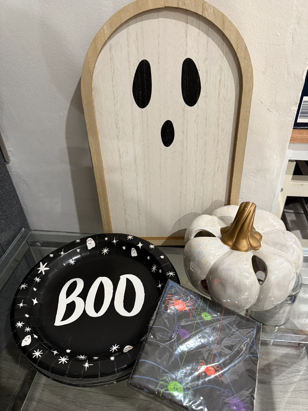 211I have a cute Halloween decor set for sale! It includes a ghost hanging decoration, a pumpkin decoration, Halloween themed napkins, and Halloween themed plates