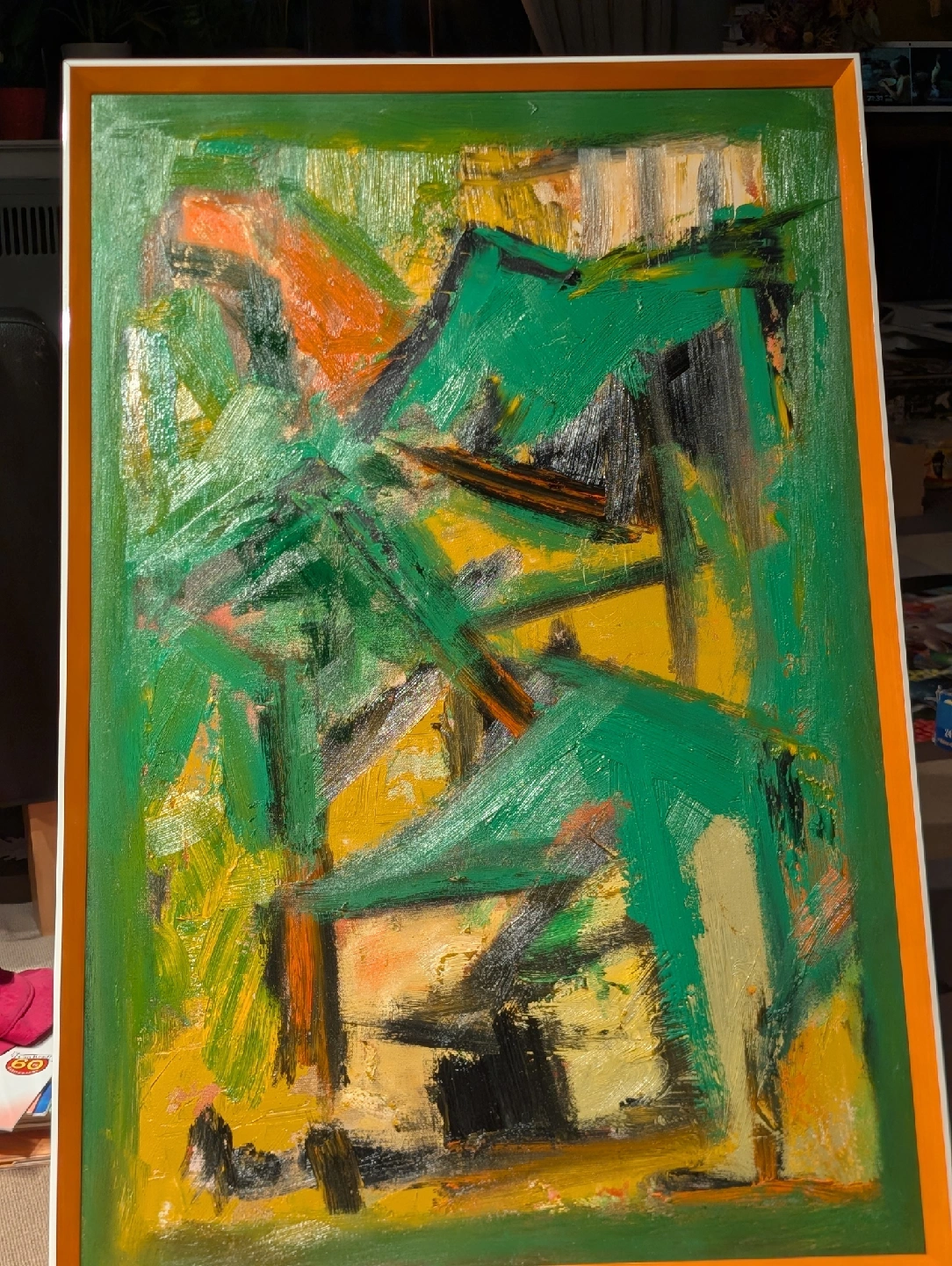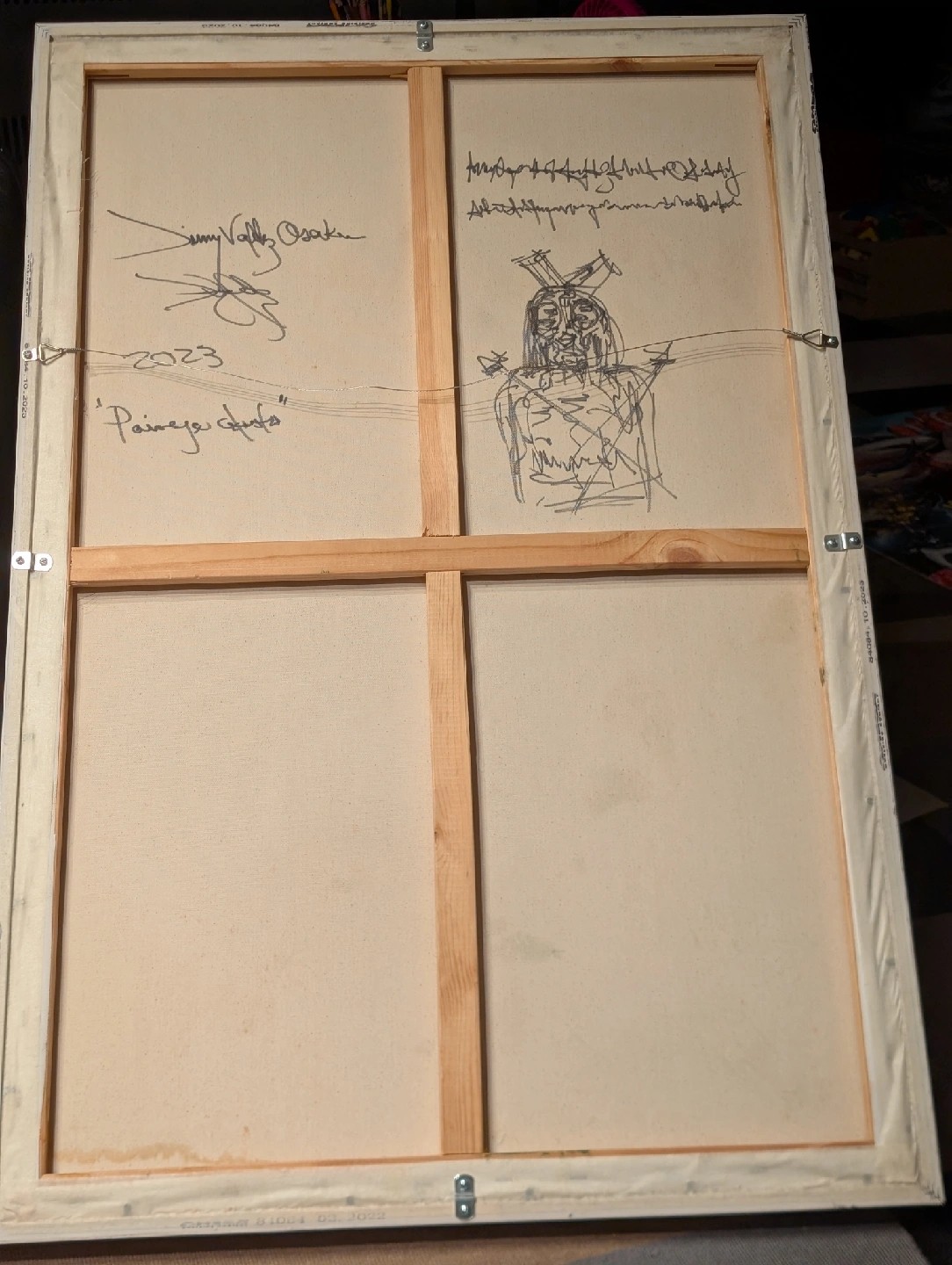 This is an original abstract painting of Jimmy Valdez Osaku. Famous Spanish and Japanese author. It features vibrant greens, yellows, and oranges. The back of the painting has some writing and a sketch.