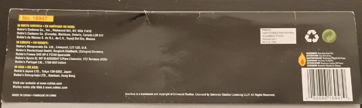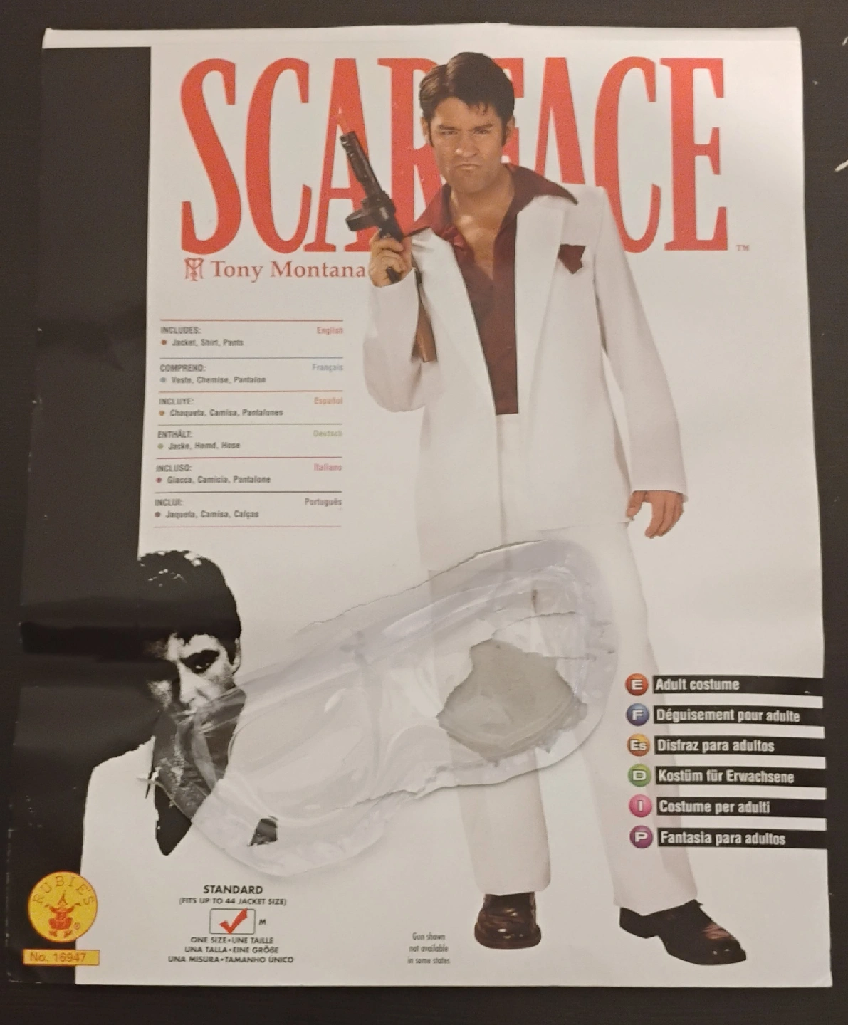 67Selling a Scarface Tony Montana adult costume. It includes the sunglasses, jacket, shirt, and pants. The costume is white. one size fit most for adult. Halloween costume. Cash only Meet up spot Montrose and Milwaukee at Anytime except for midnight.