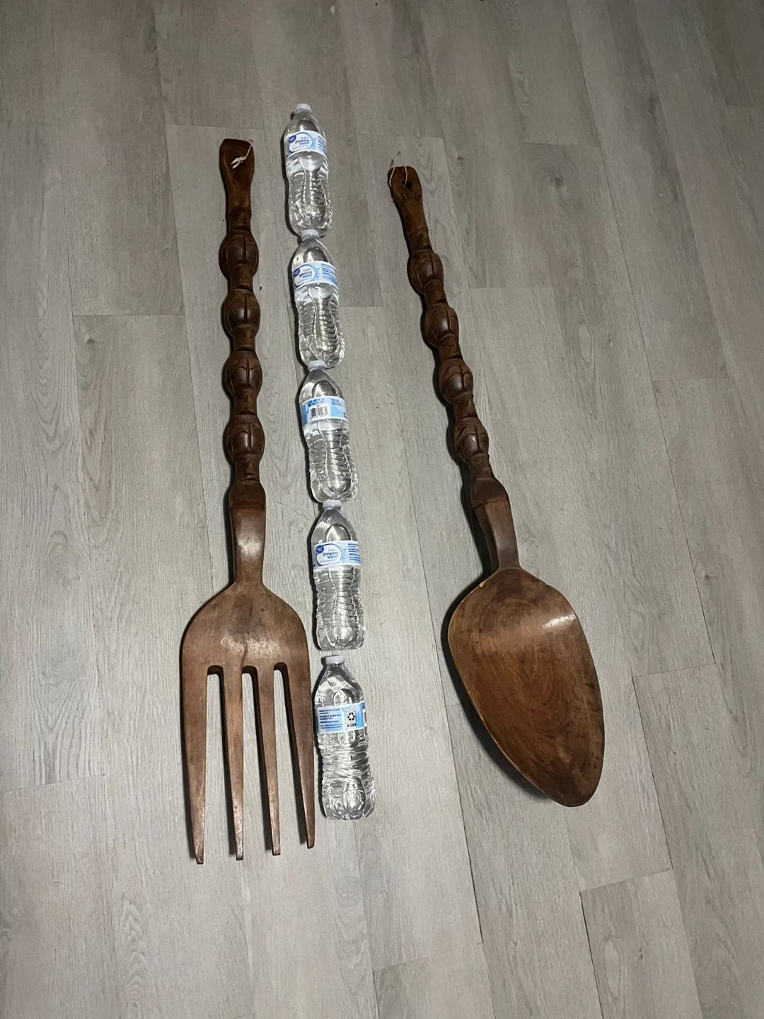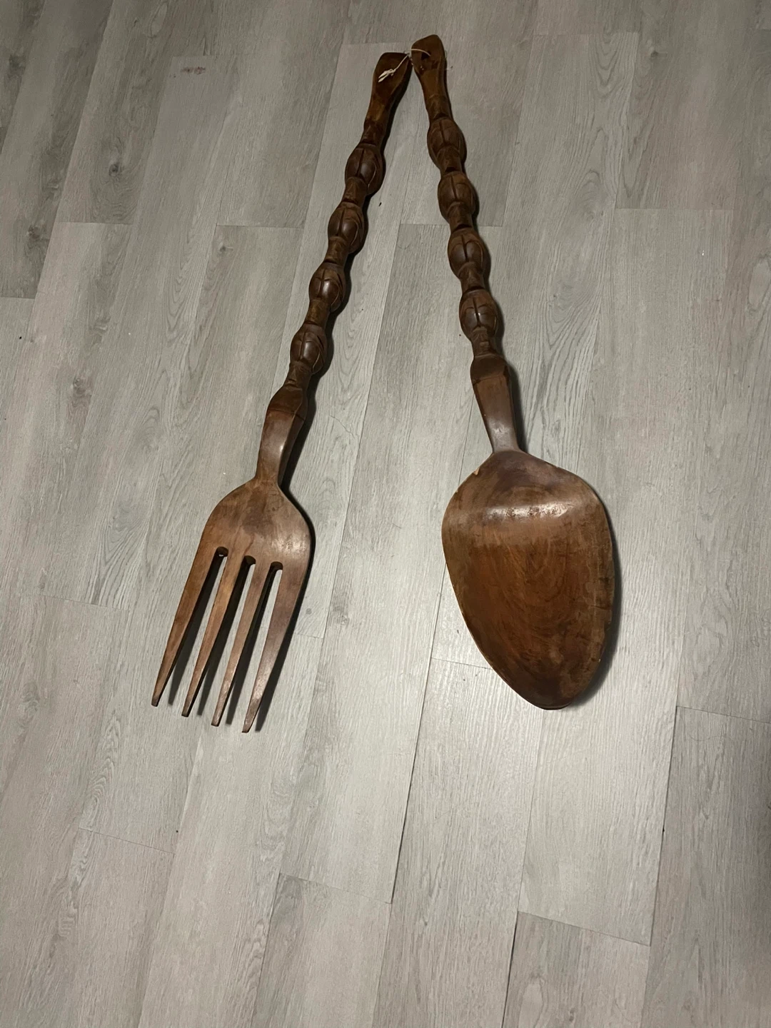 64Selling a vintage wooden fork and spoon set, perfect for wall decor! They're in good condition and would add a unique touch to any kitchen or dining area