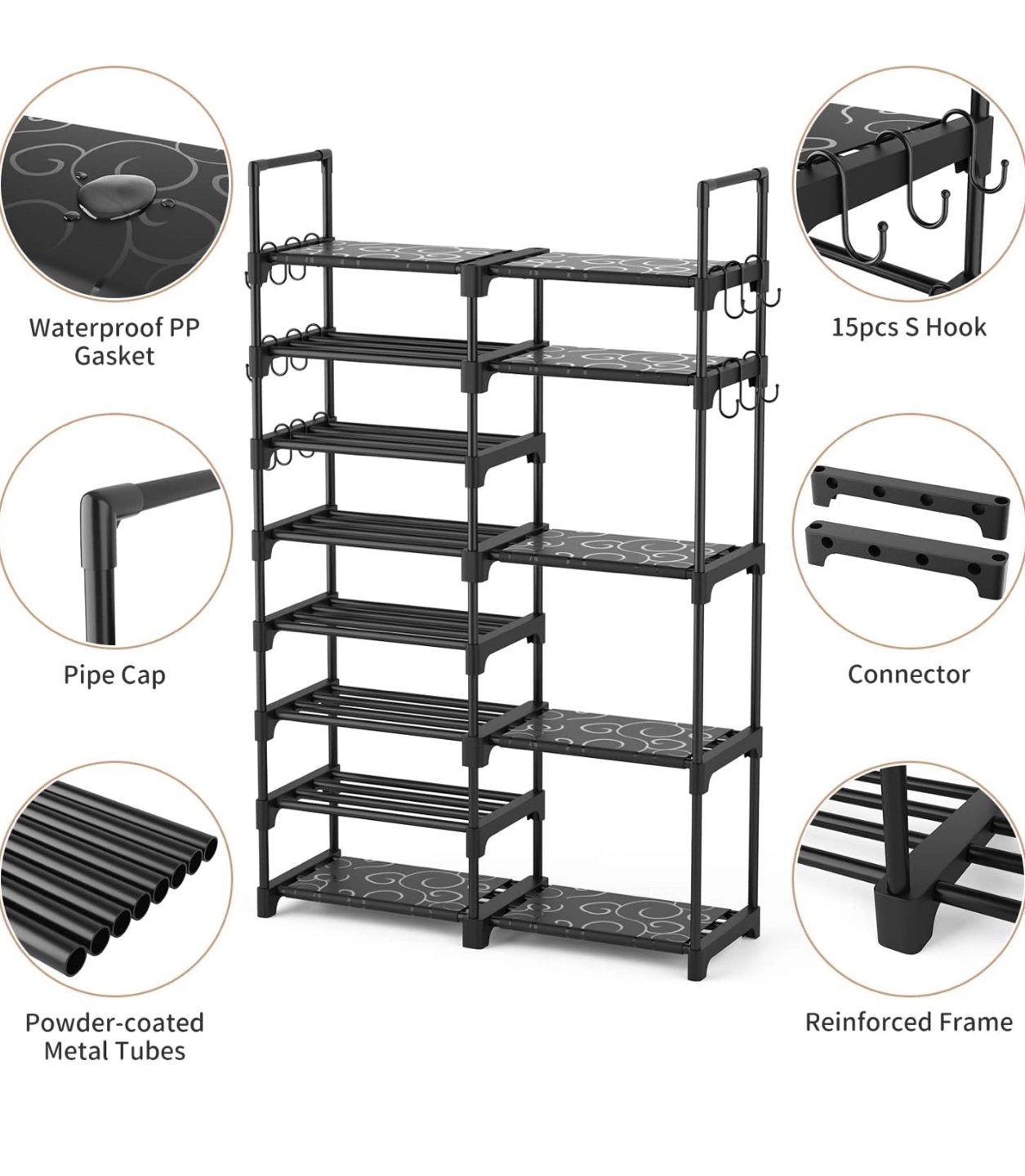 7-Tier Shoe Rack Organizer with Hooks, Black