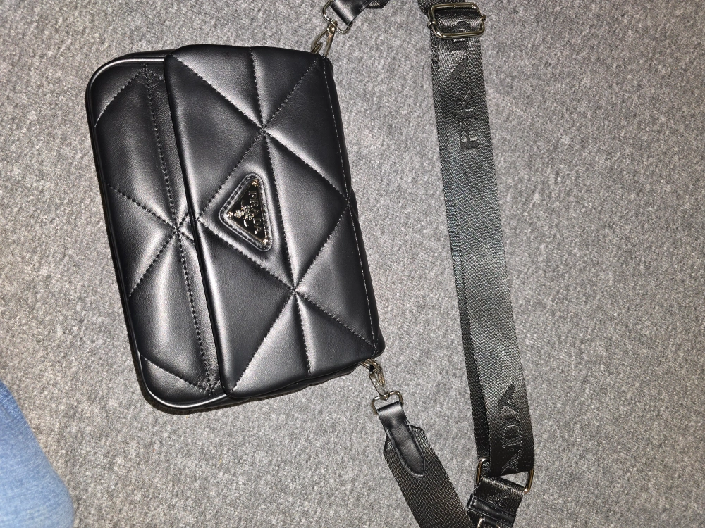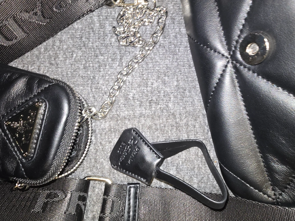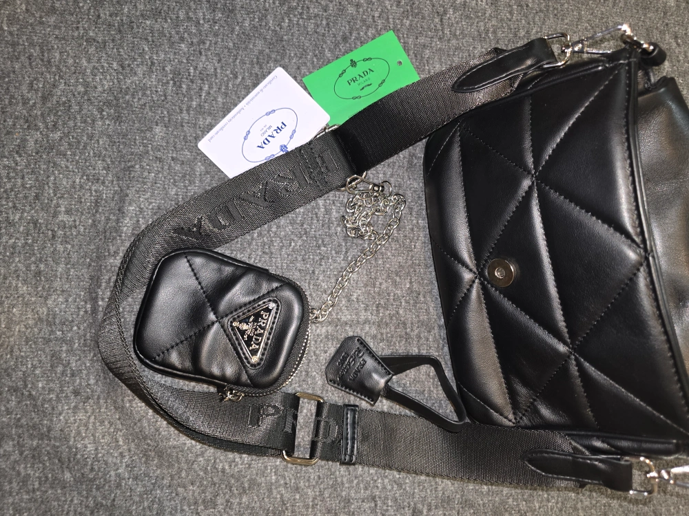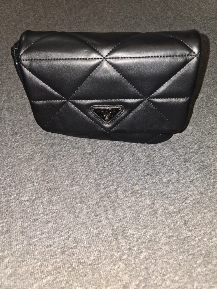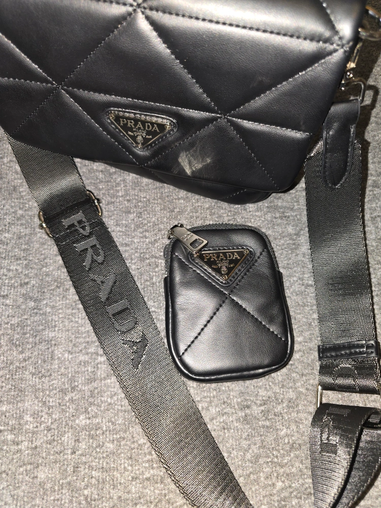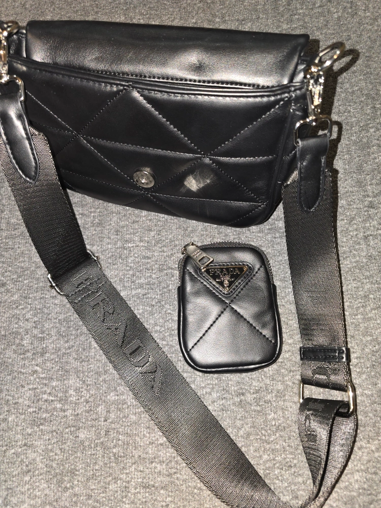 65Selling a stylish Prada black quilted shoulder bag. It comes with a detachable pouch. The bag features a quilted design and a Prada logo. Perfect for adding a touch of luxury to your outfit!