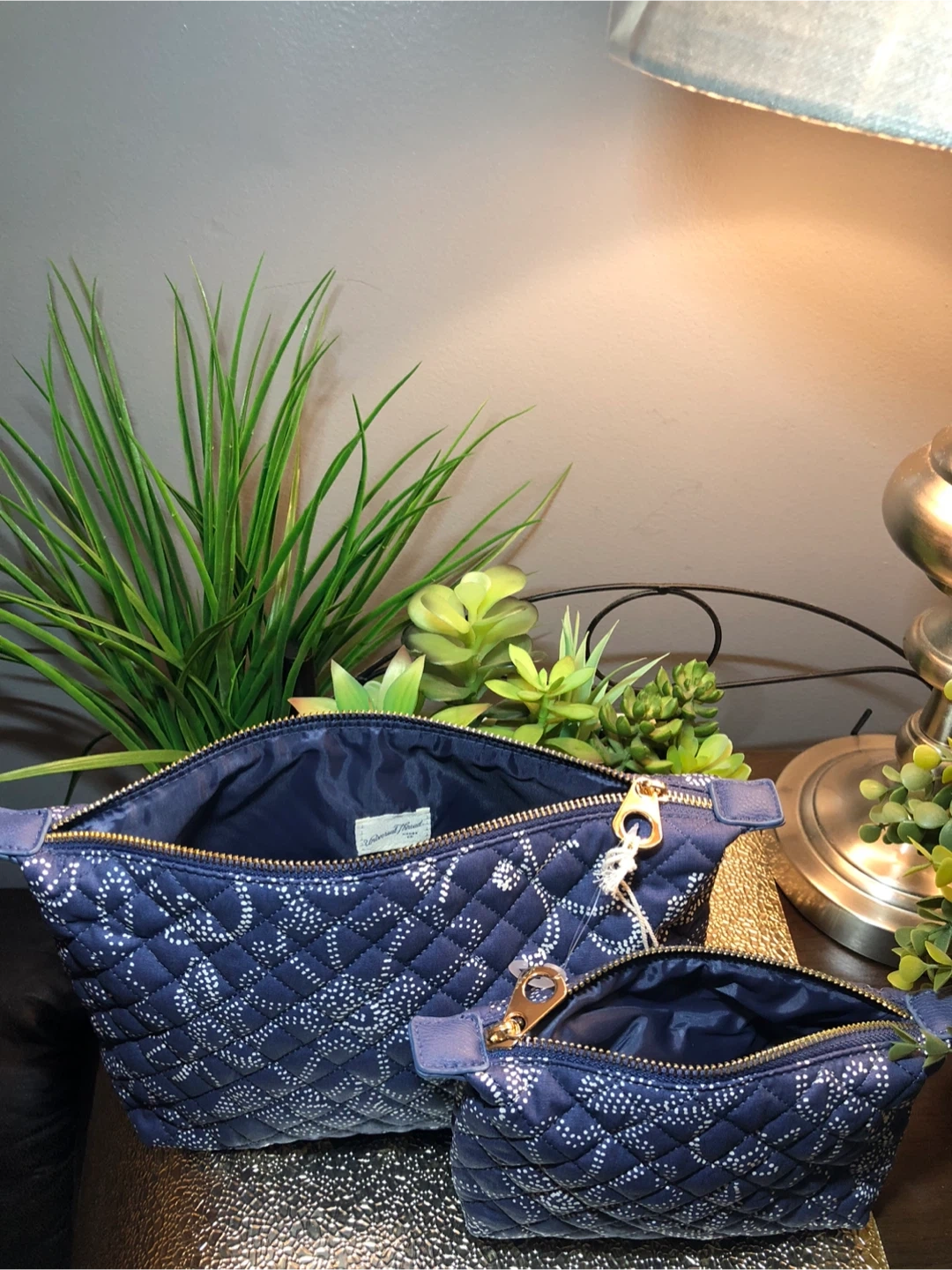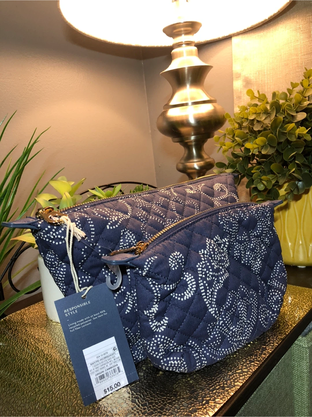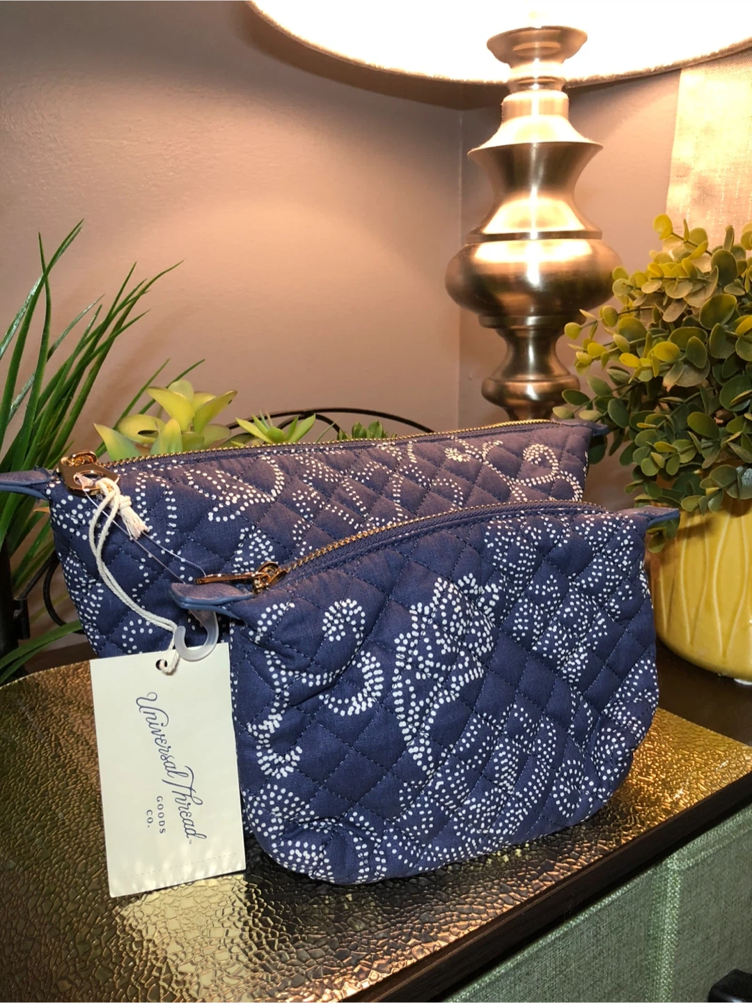 15Here's a brand new set of Universal Thread cosmetic bags! The set includes two quilted bags in a navy blue color with a white floral pattern. These are perfect for travel or everyday use to keep your makeup and toiletries organized