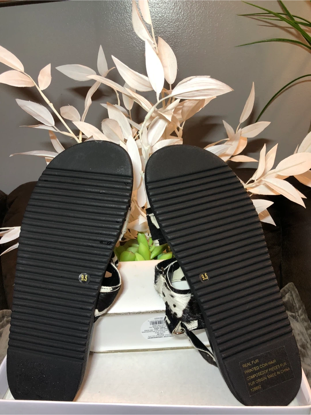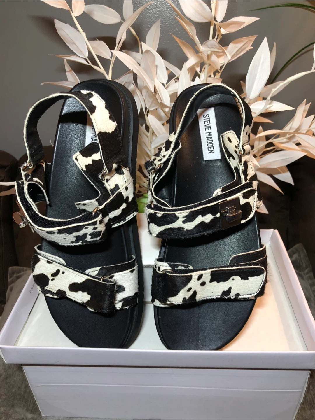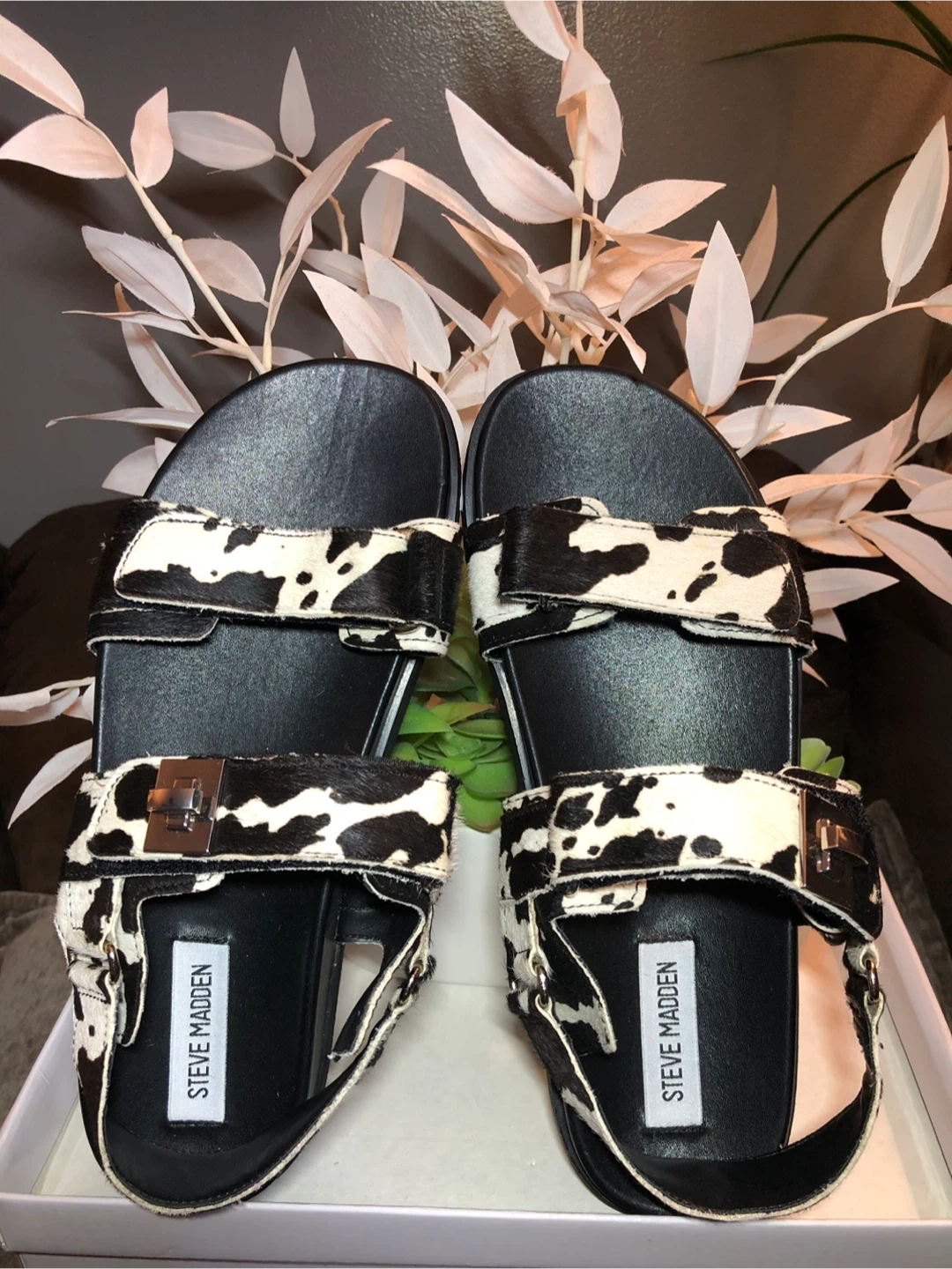 26These Steve Madden sandals feature a unique cow print design! They are a women's size 9.5