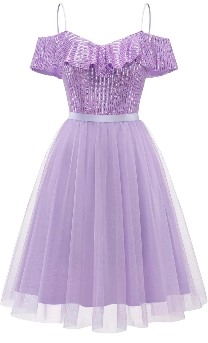 60This is a beautiful girls' party dress in a lovely shade of purple. The top features sparkly sequins and a ruffled off-the-shoulder design, while the skirt is made of flowy tulle. Perfect for a special occasion!