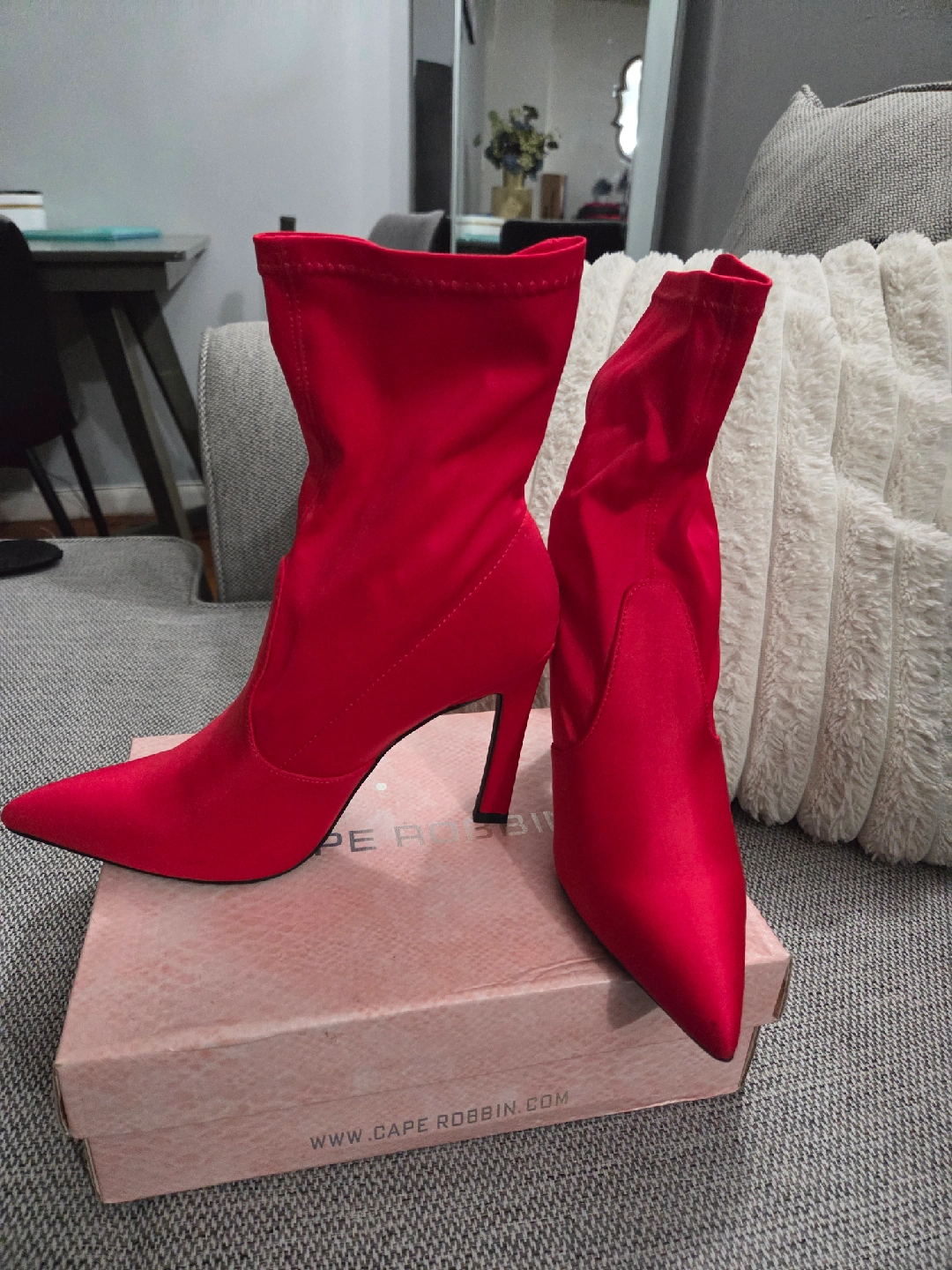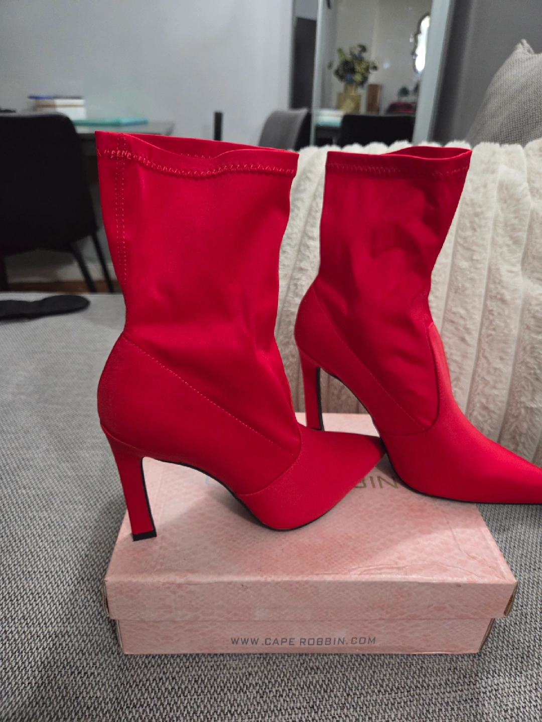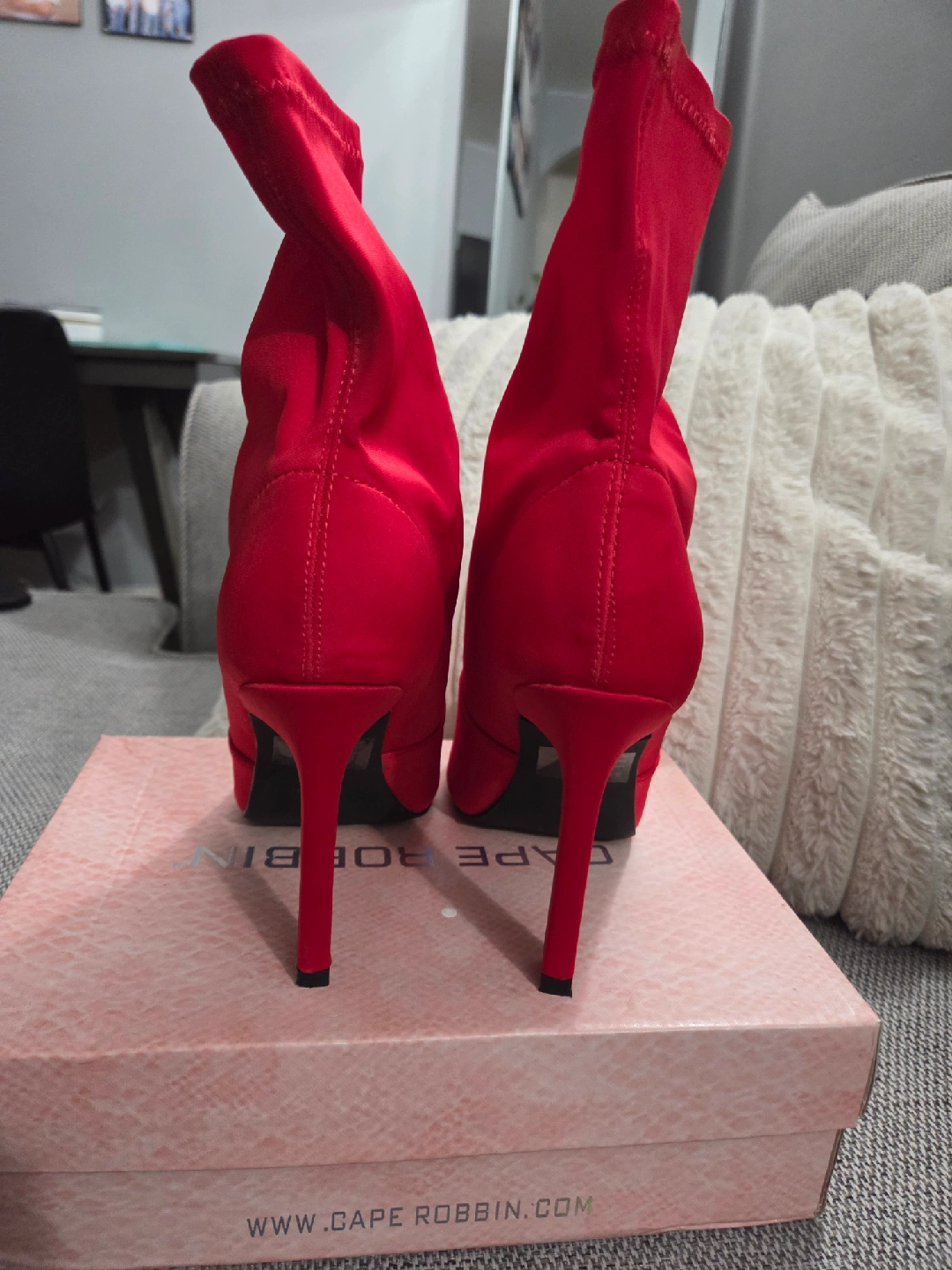 60Selling a pair of Cape Robbin heeled booties in a vibrant red color. These come in the original box. They are a size 8.5