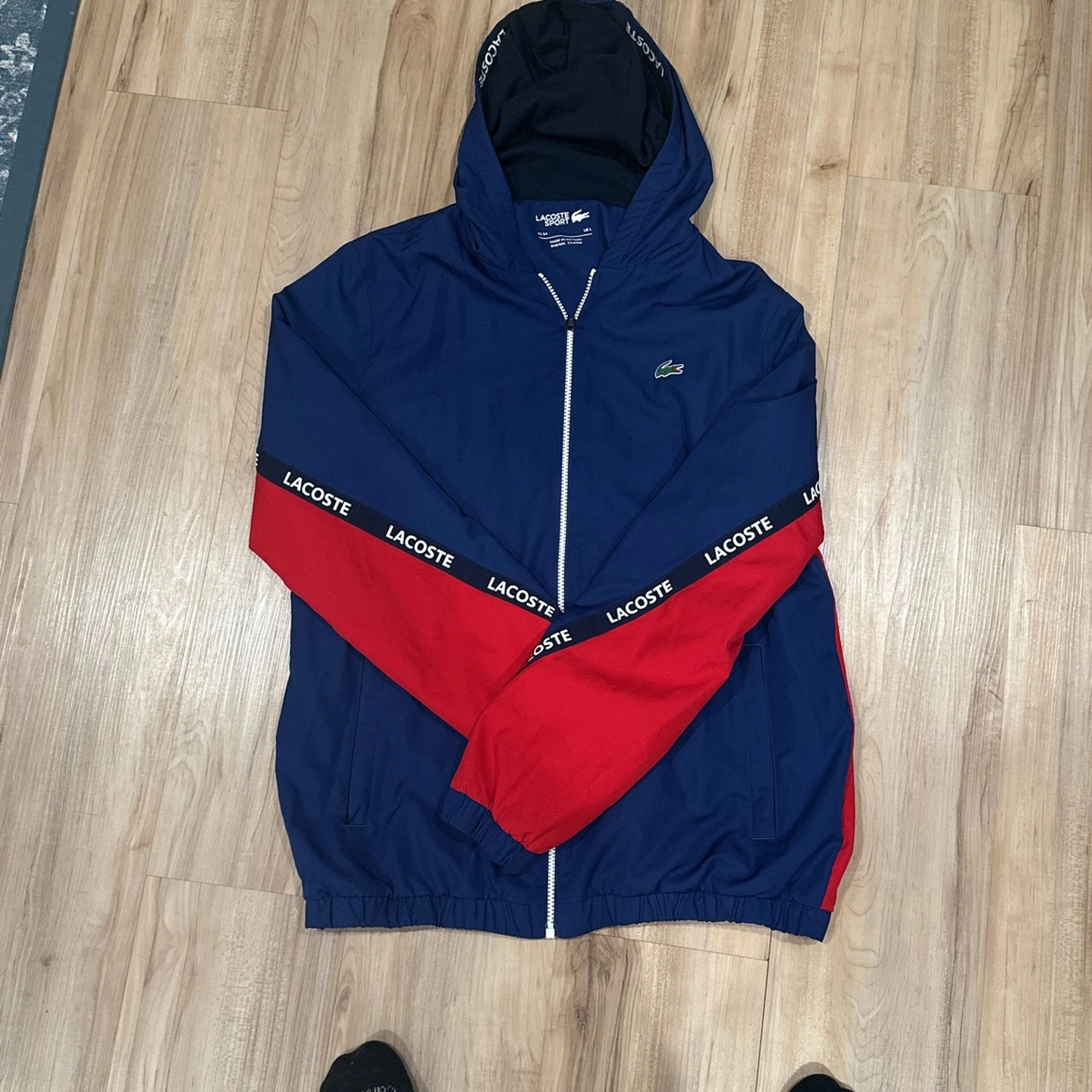 Size L. Blue and red zipper pockets sport jacket. No rips, worn only 3 times. Size Type: Regular Size: L Color: Red/blue Material: Polyester Sleeve Length: Long sleeve Brand: Lacoste