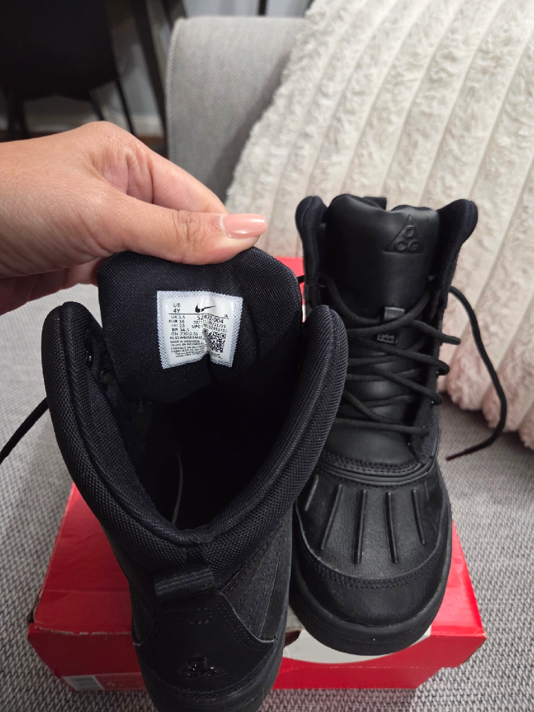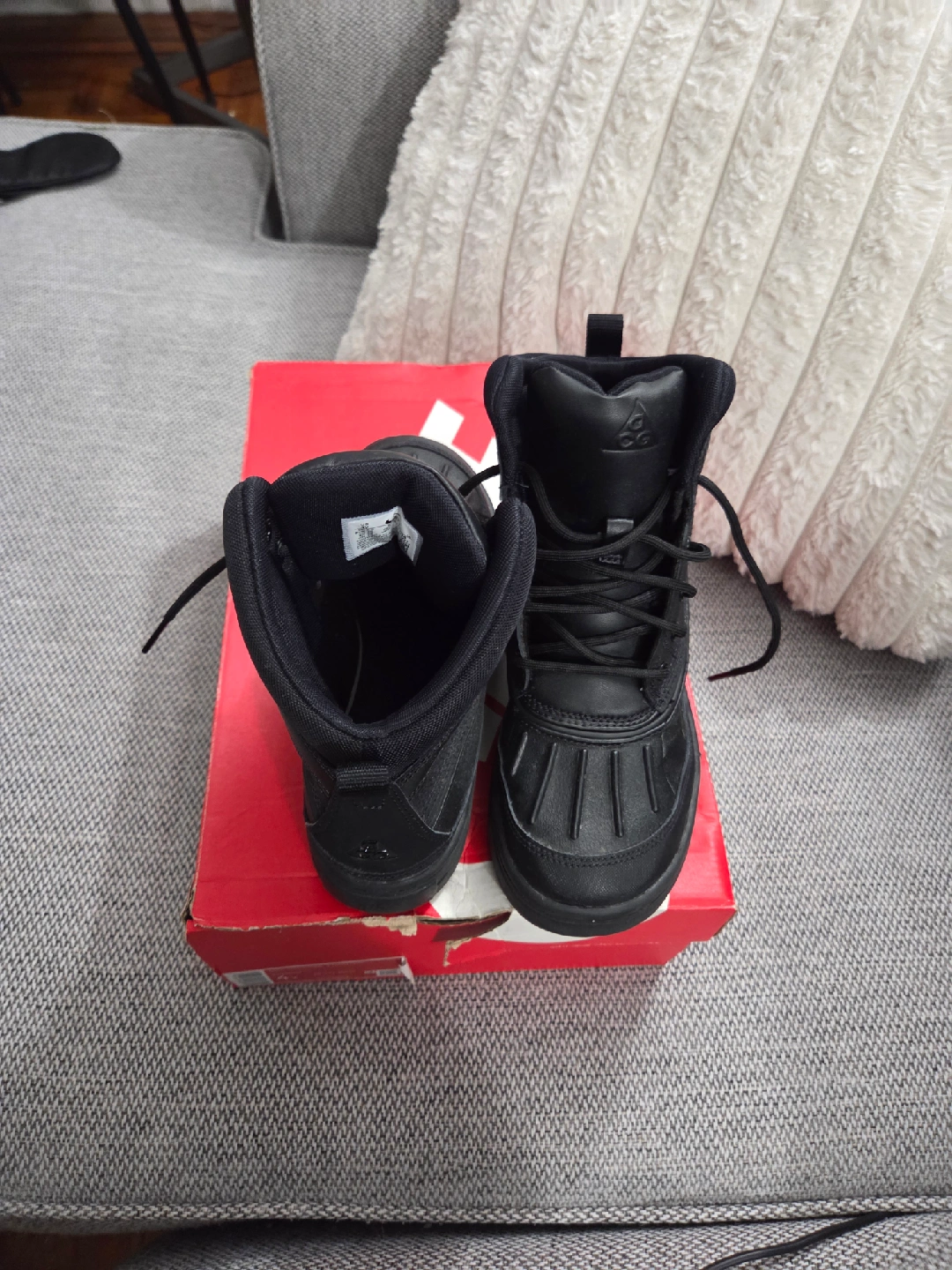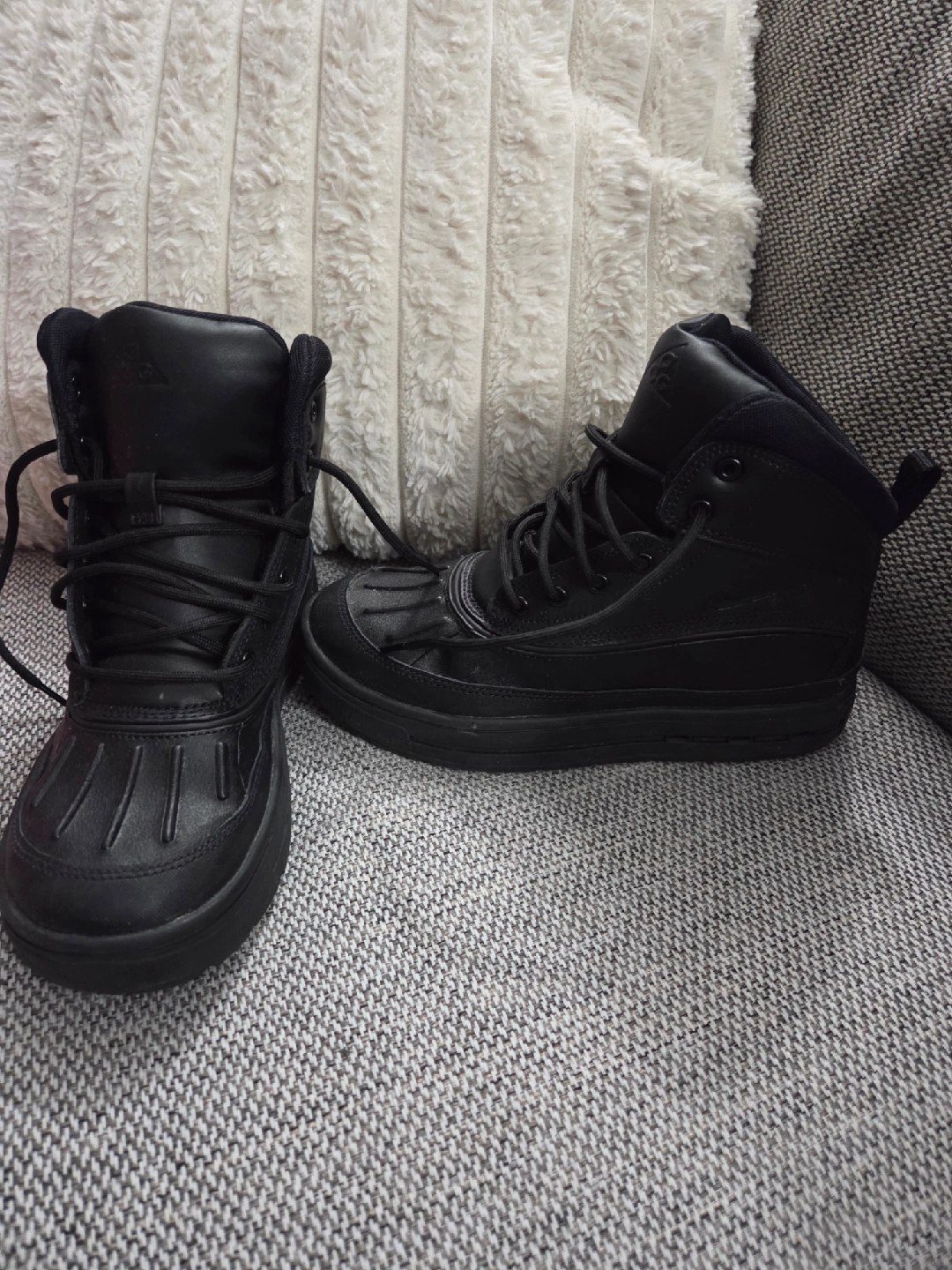 60Selling a pair of Nike Woodside 2 High (GS) Boots – Black (Youth Size 4Y) These Nike Woodside 2 High (GS) boots are in great condition and come with the original box! Designed for durability and comfort, they feature a water-resistant upper, rugged sole for traction, and warm interior lining — perfect for everyday wear or cold, wet weather. ✨ Details: Color: Black Size: Youth 4Y Condition: Gently used / Excellent condition Comes with original Nike box Stylish, sturdy, and ready for the season — grab them before they’re gone! Perfect for keeping your feet warm and dry!