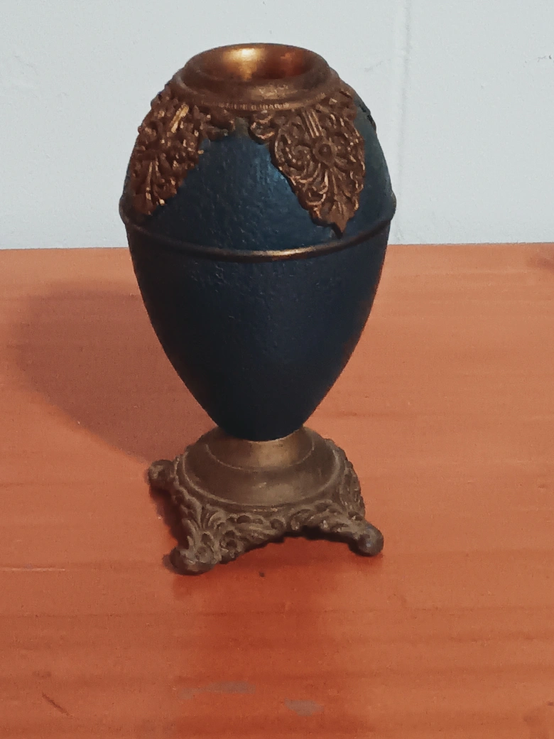 60Selling a unique decorative vase! It has an egg shape with a detailed floral design around the top. The vase is a dark blue color with gold accents and a gold stand