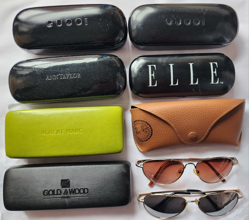 97SUNGLASSES CASES FROM VARIOUS BRANDS. GUCCI, ANN TAYLOR, ELLE,, ROBERT MARC,, GOLD ANDWOOD (PARIS) RAY-BAN. PLUS 2 GLASSES $15 EACH BUYER HAS TO PICK UP CASH ONLY