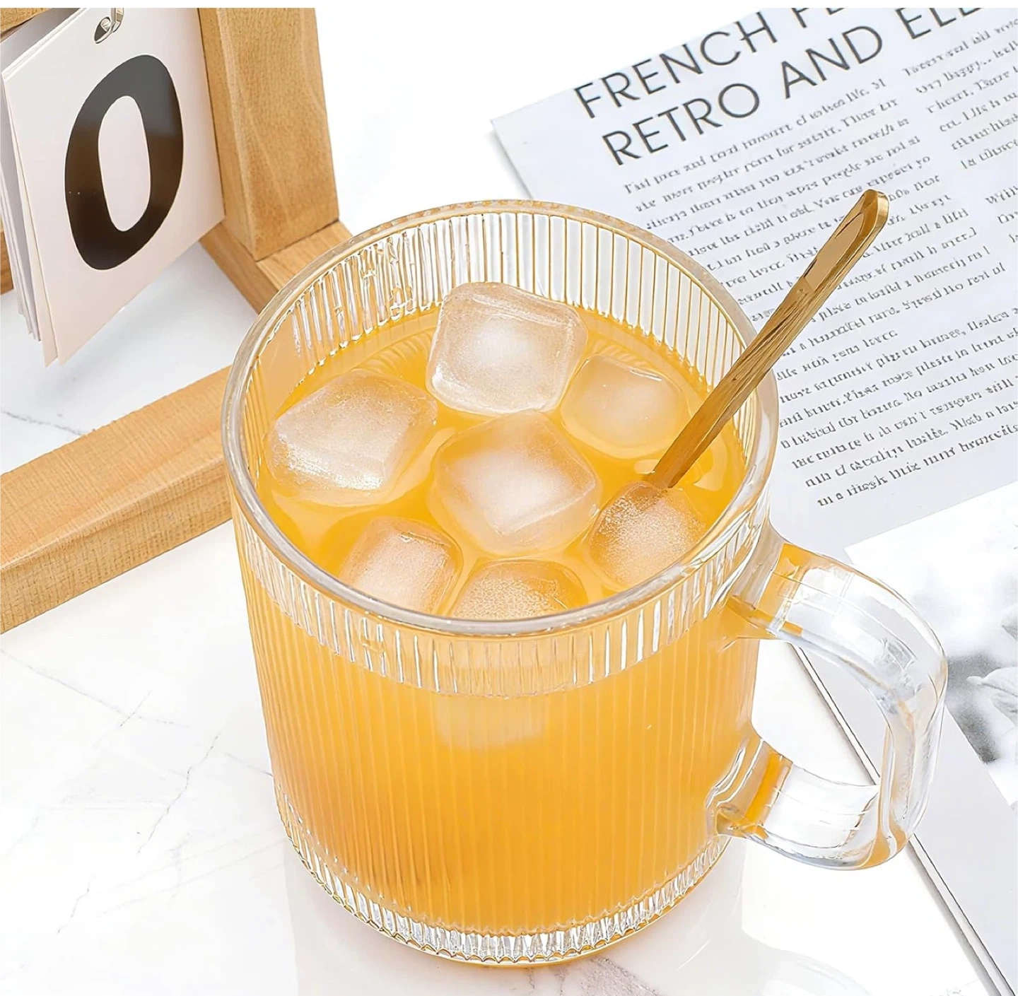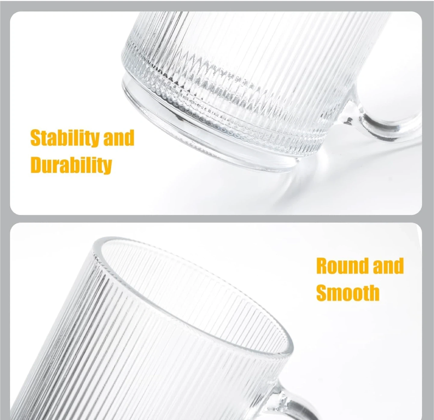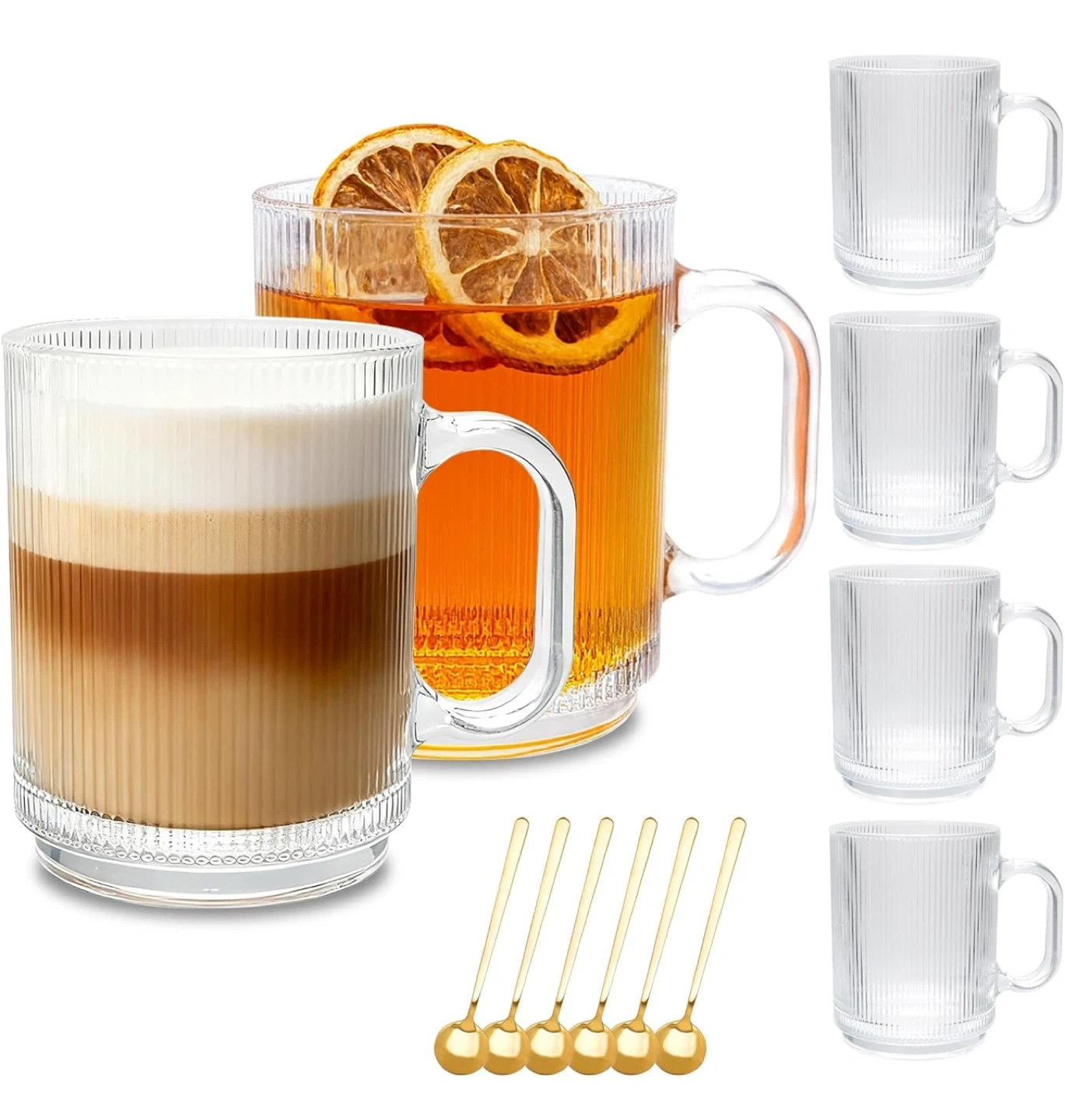 6 PACK Glass Coffee Cups with Handle & Spoon, 12 OZ Glass Coffee Mugs, Ribbed Glass Cups, Clear Tea Cup for Hot/Cold Beverages, Glassware Set for Americano, Latte, Cappuccino