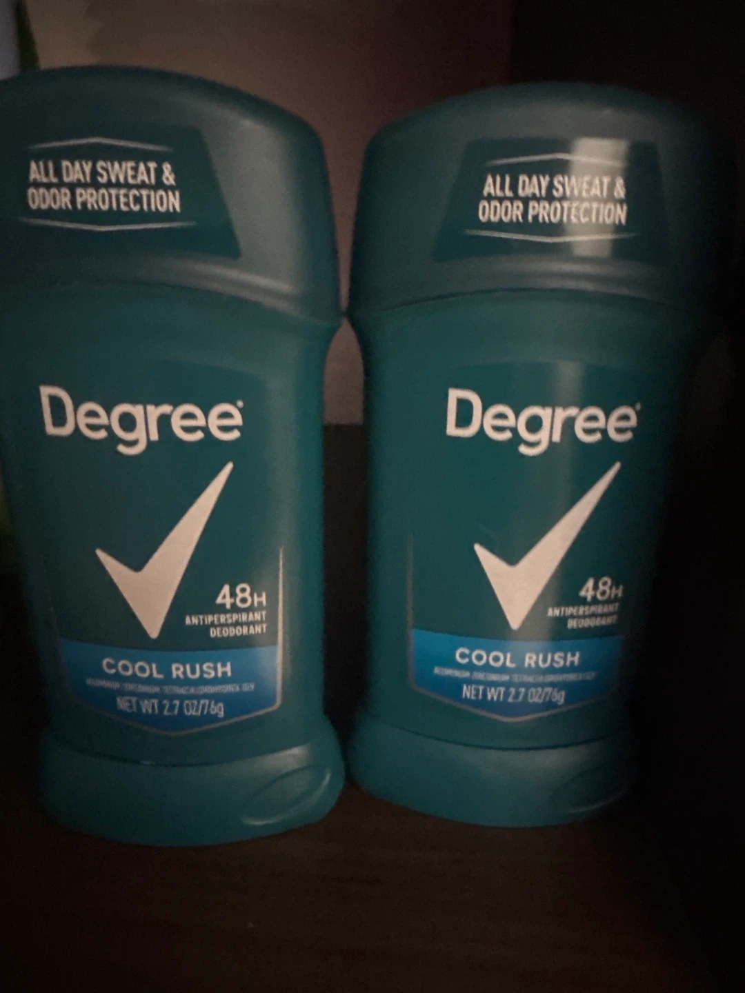Selling two Degree Cool Rush antiperspirant deodorants. They provide all-day sweat and odor protection and are 48H antiperspirant deodorants. Each one has a net weight of 2.7 oz/76g
